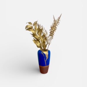 Vase décoratif relooké bleu electrique et marron glacé avec feuille d’or