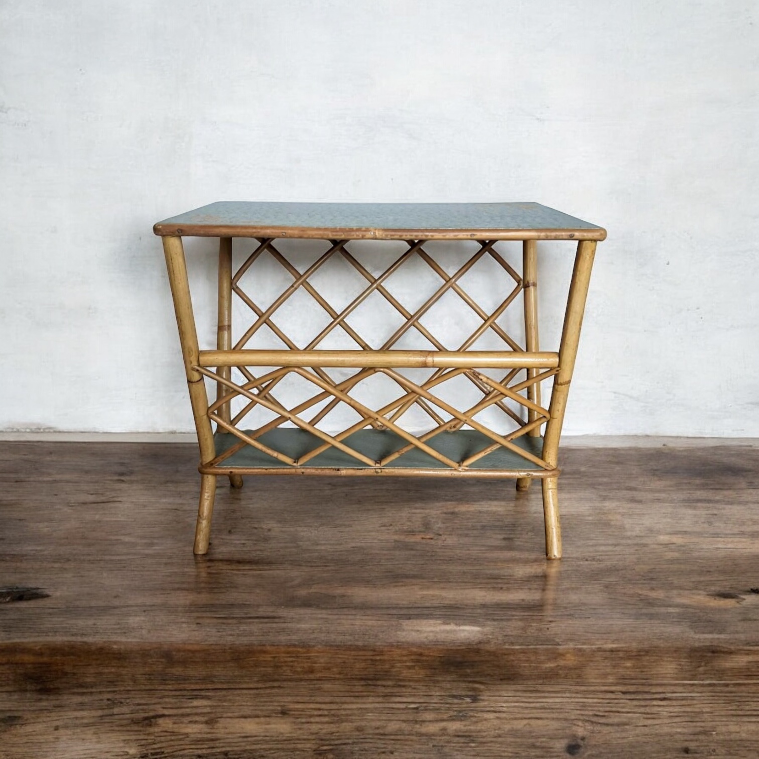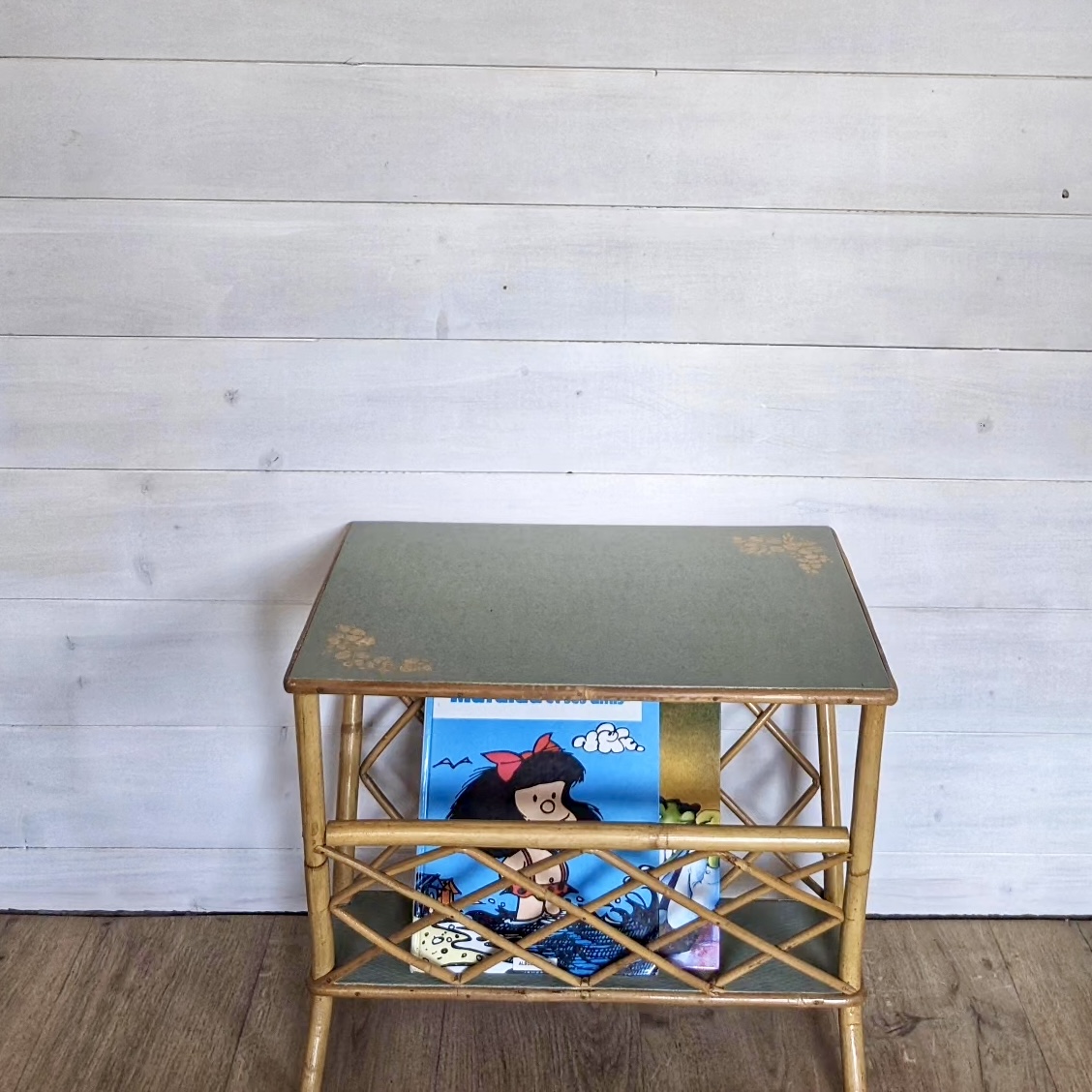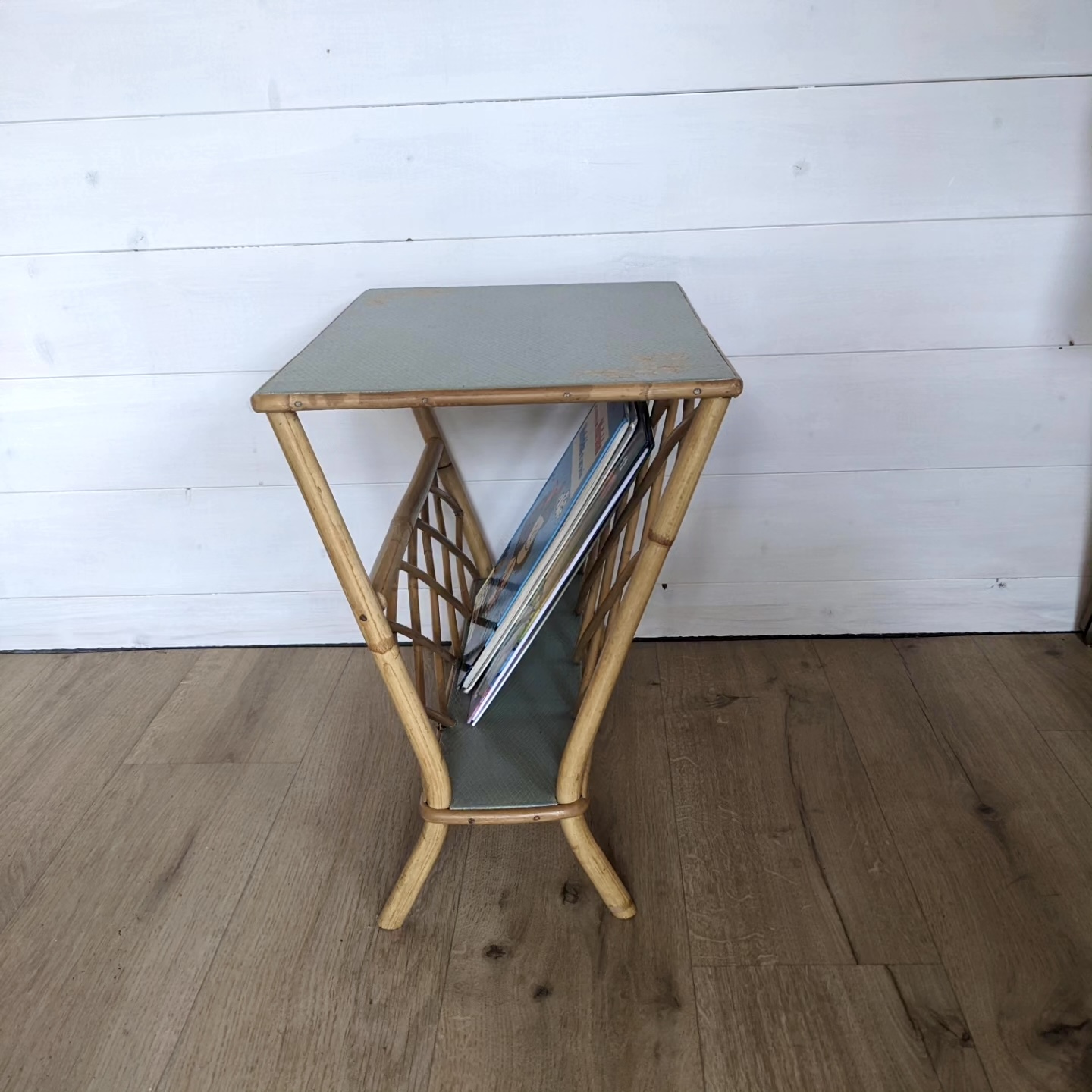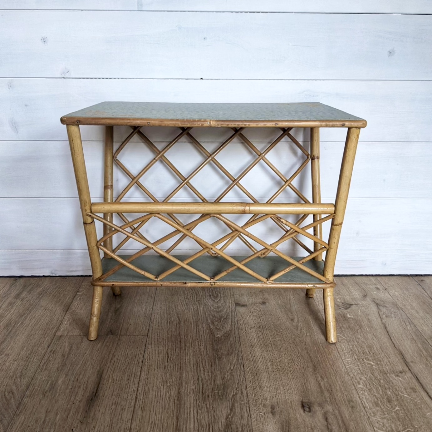 Porte-revue vintage en rotin avec tablette vert sauge – Élégance naturelle et touche bohème