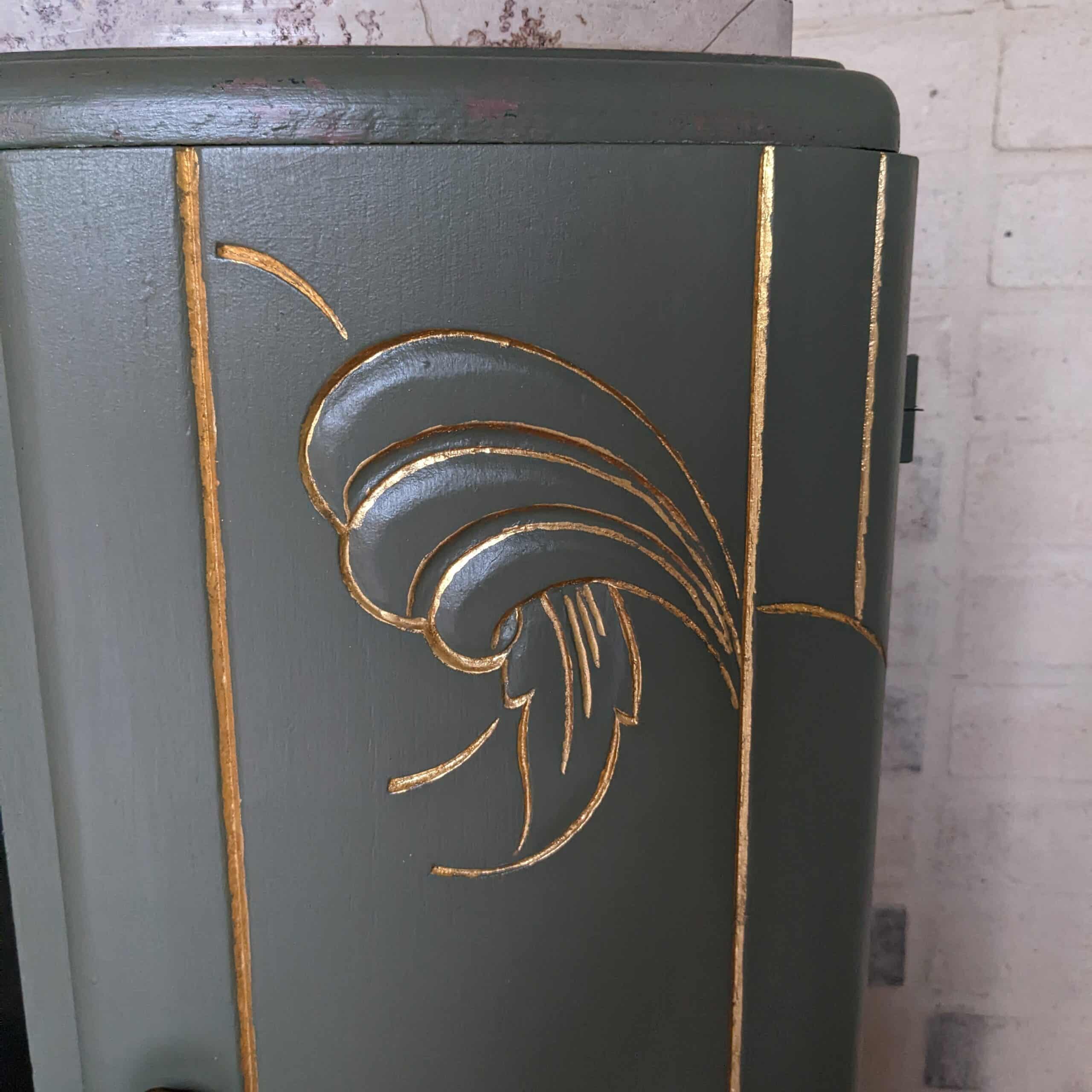 Ce bahut bas Art déco allie le charme de l’ancien à une esthétique contemporaine : vert kaki, motifs floraux gravés et dorés à la cire, et un plateau en marbre d’origine. Une pièce rare et raffinée, idéale en meuble de rangement chic.