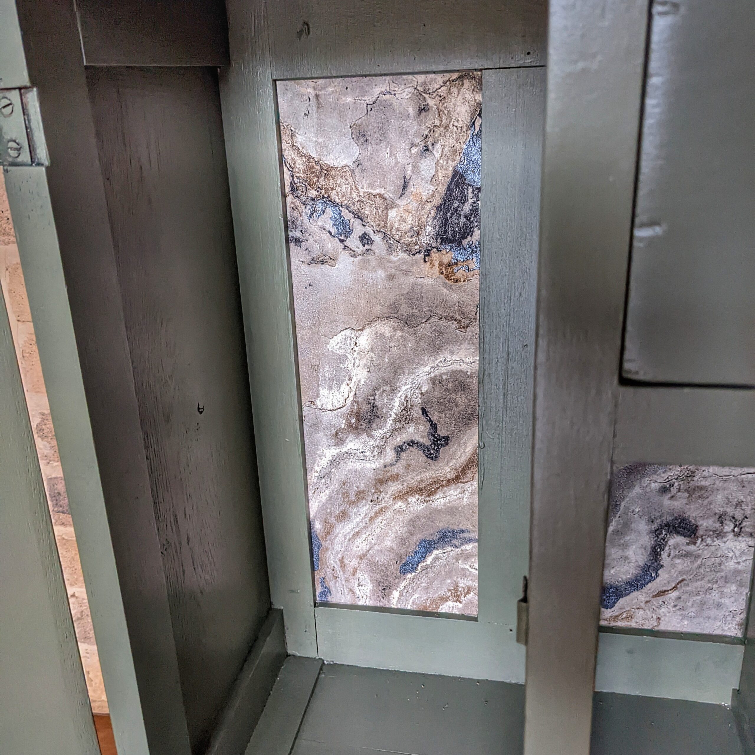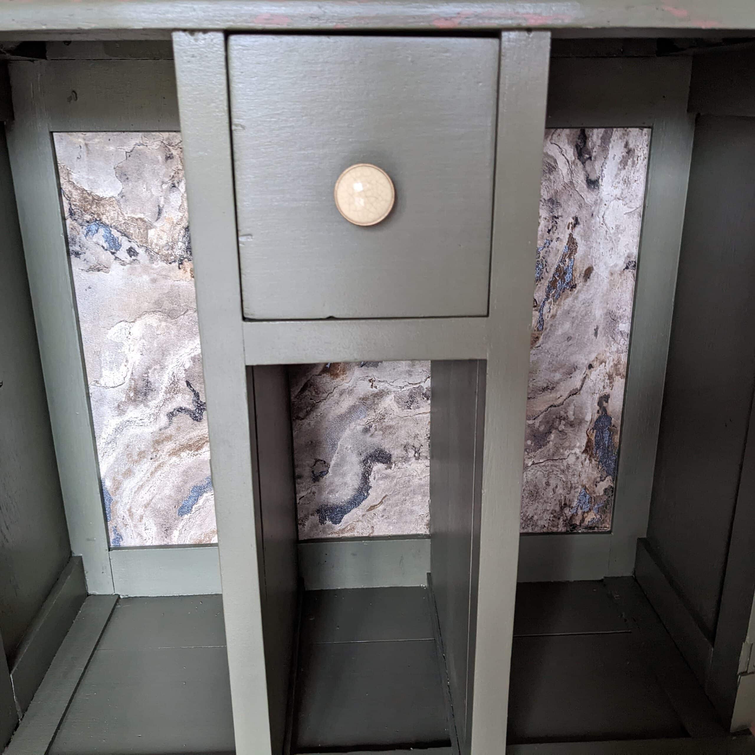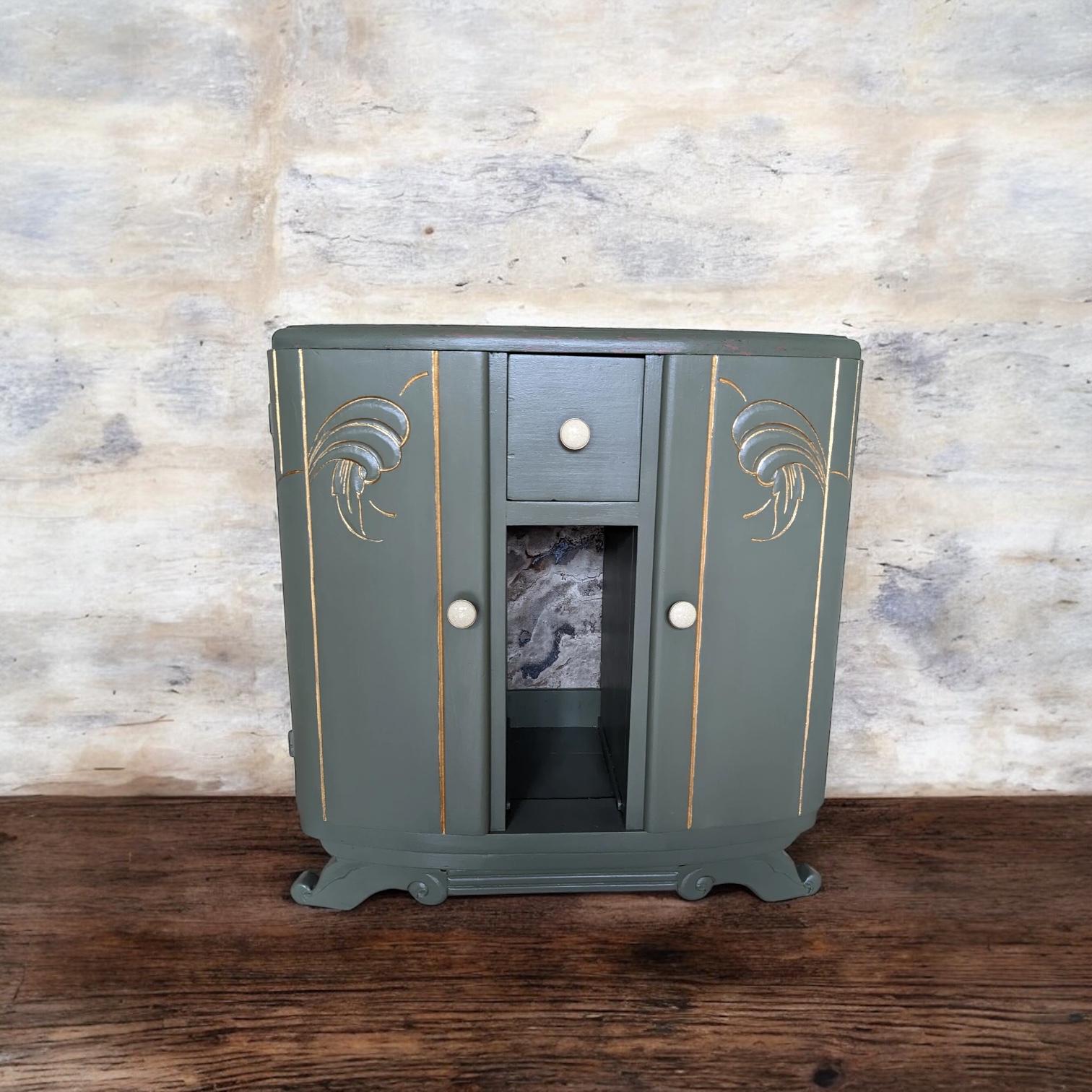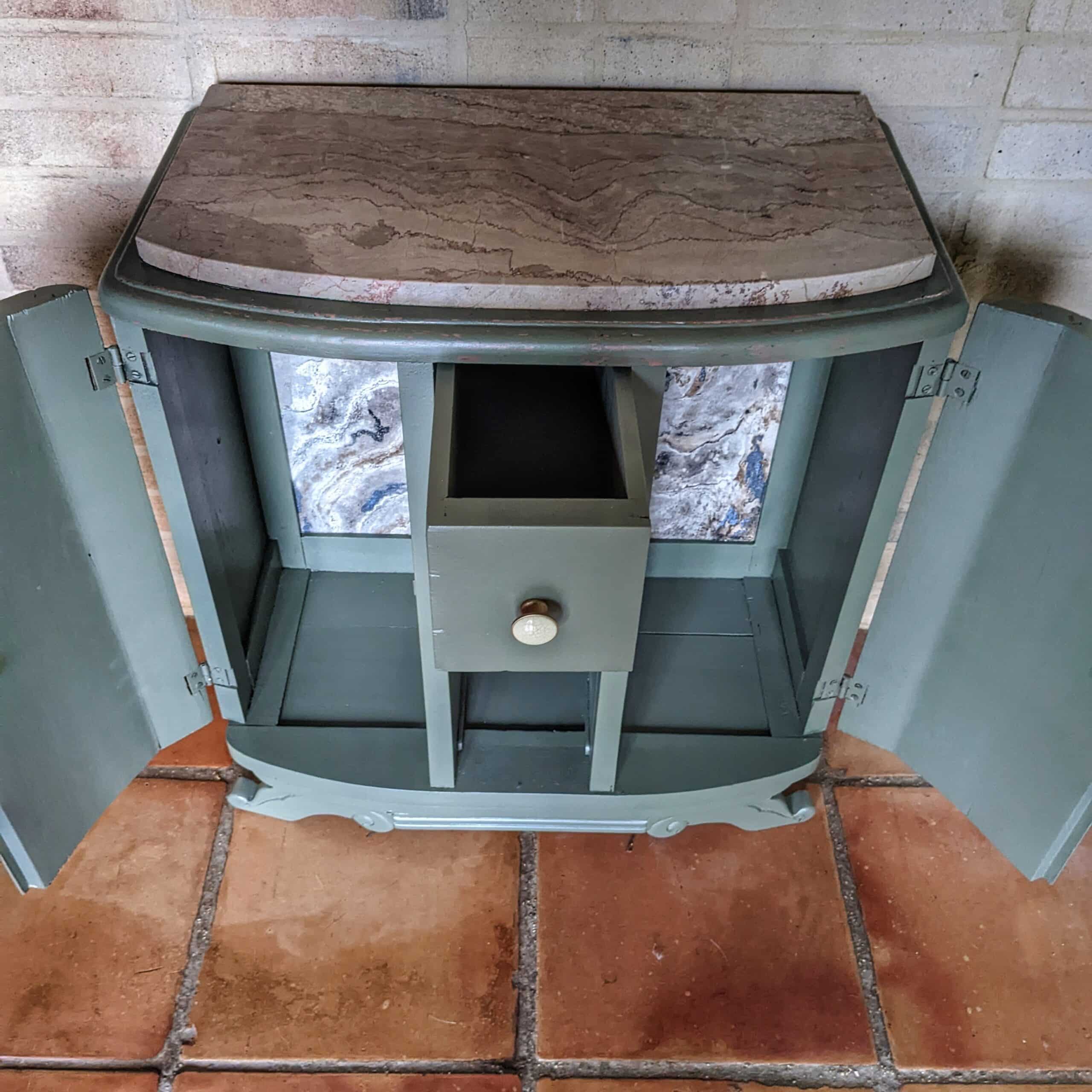 Bahut bas Art déco vert kaki et marbre – Meuble de rangement vintage relooké