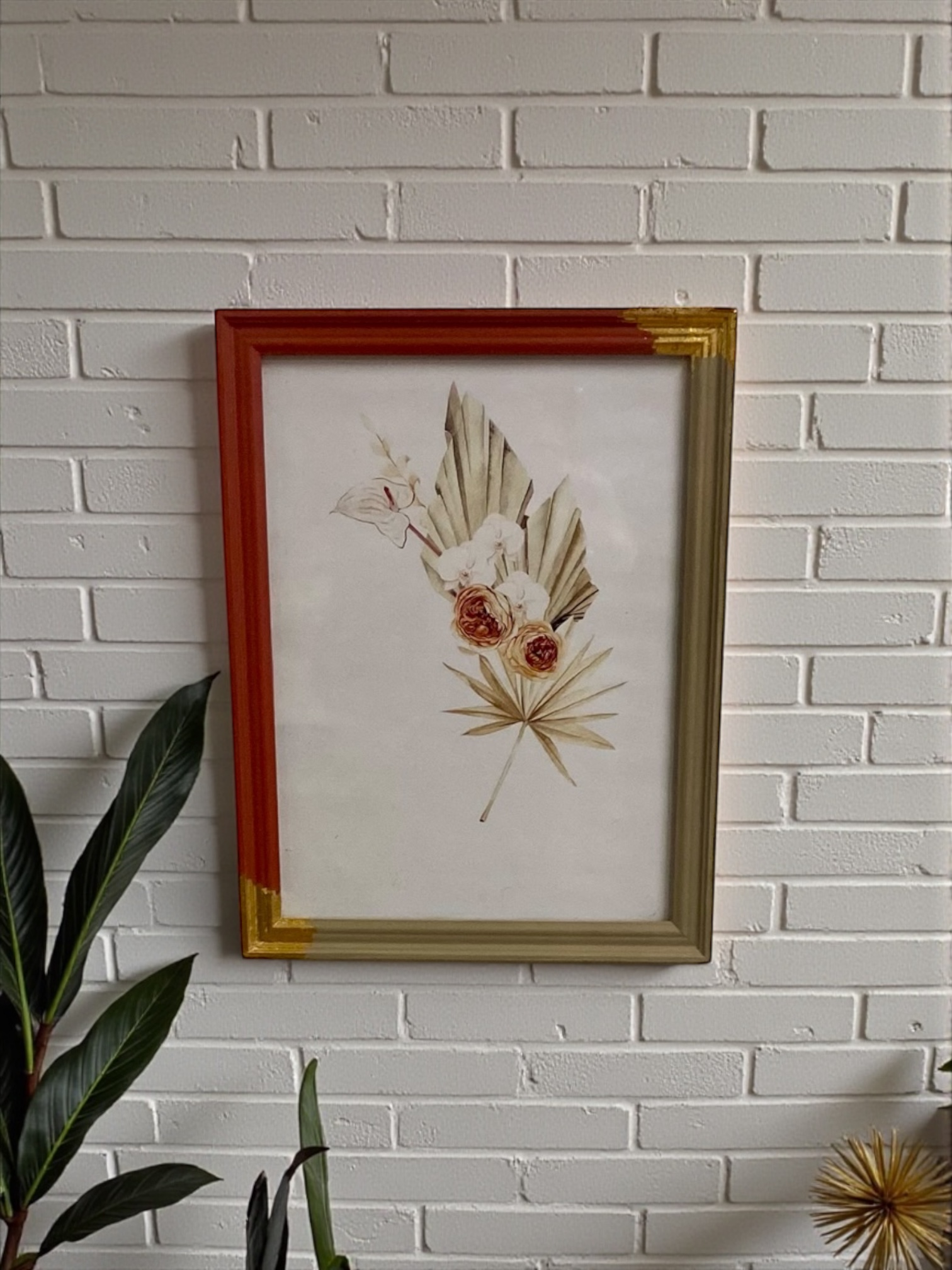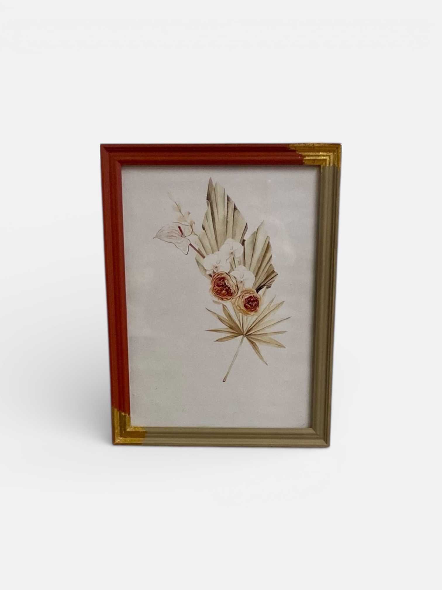 Cadre ancien relooké à la main en terracotta et beige, avec finitions délicates et touches dorées.