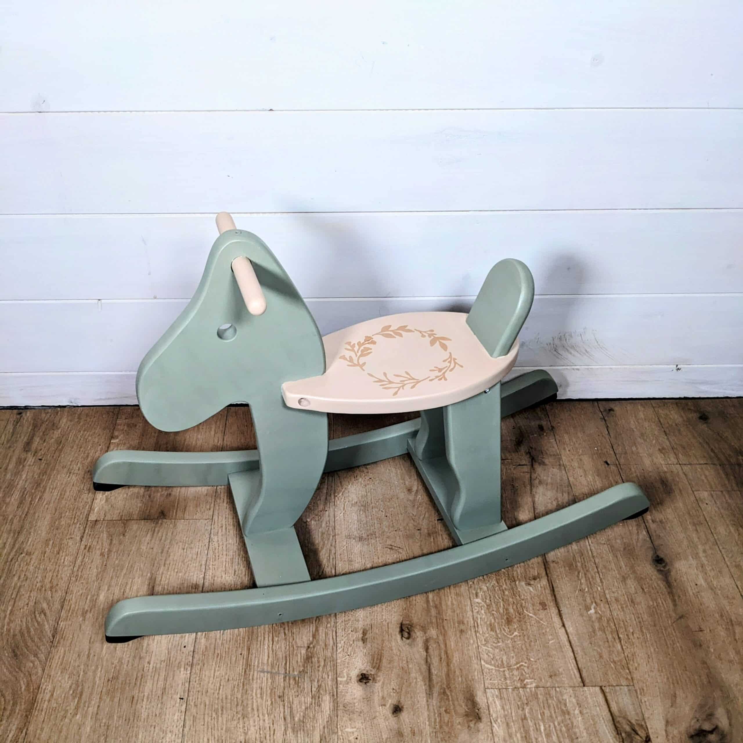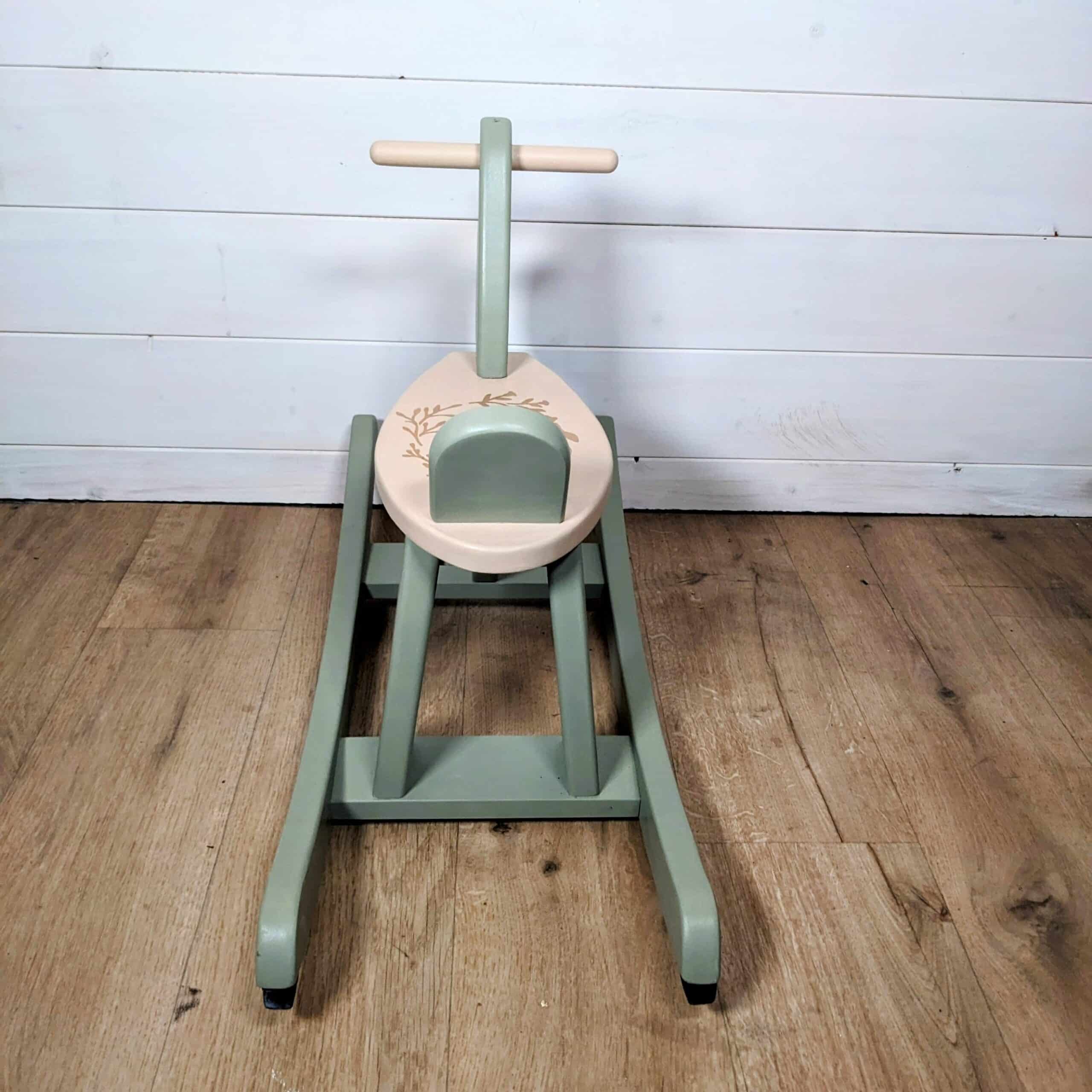 - Relooké avec Tendresse : Le cheval à bascule est relooké avec une finition en bois vert sauge, offrant une esthétique apaisante et naturelle. Les détails en beige ajoutent une touche douce à l’ensemble.