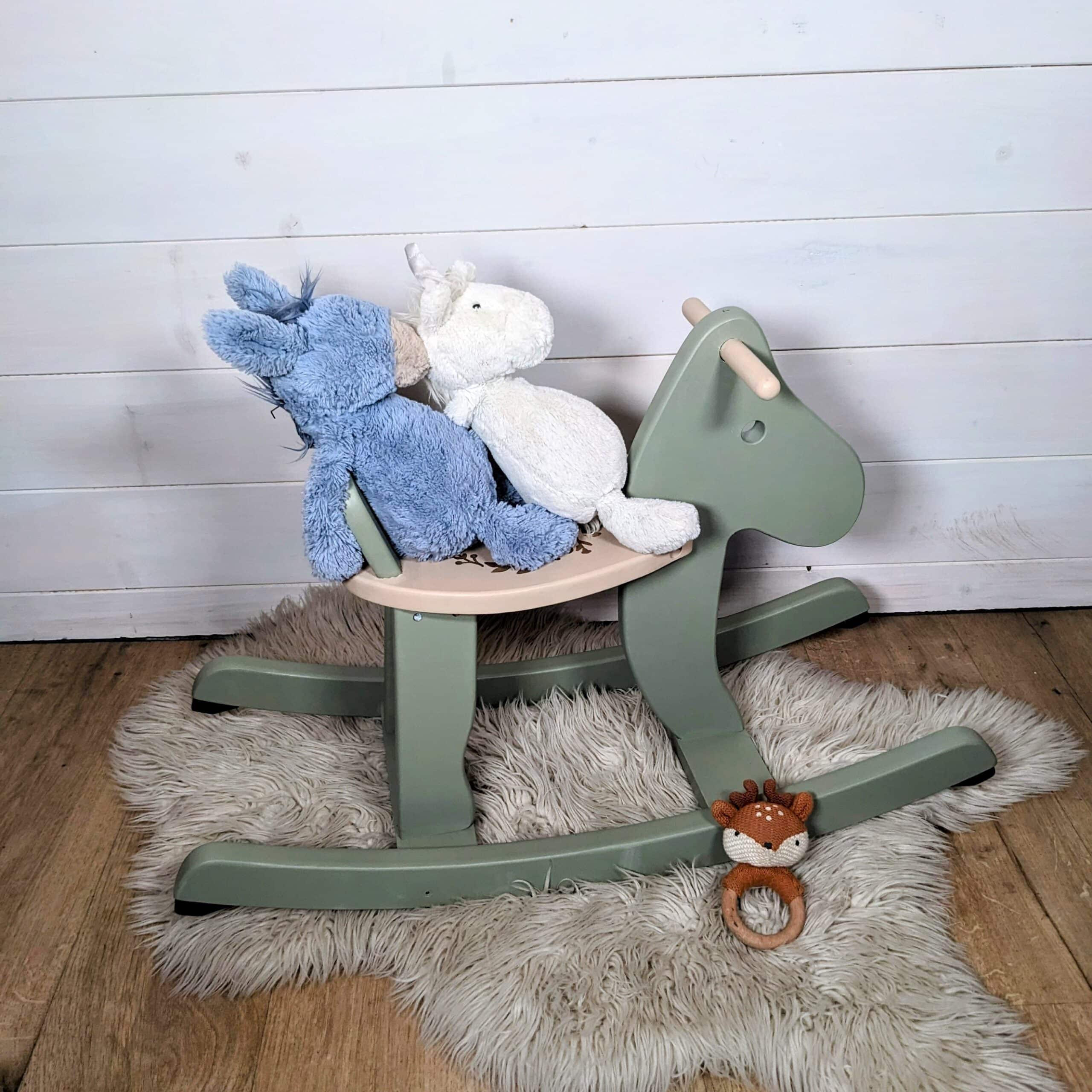 Fabriqué en bois de qualité, relooké avec une palette apaisante de vert sauge et beige, ce cheval à bascule deviendra le compagnon préféré de votre enfant.