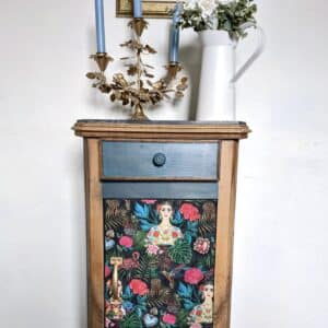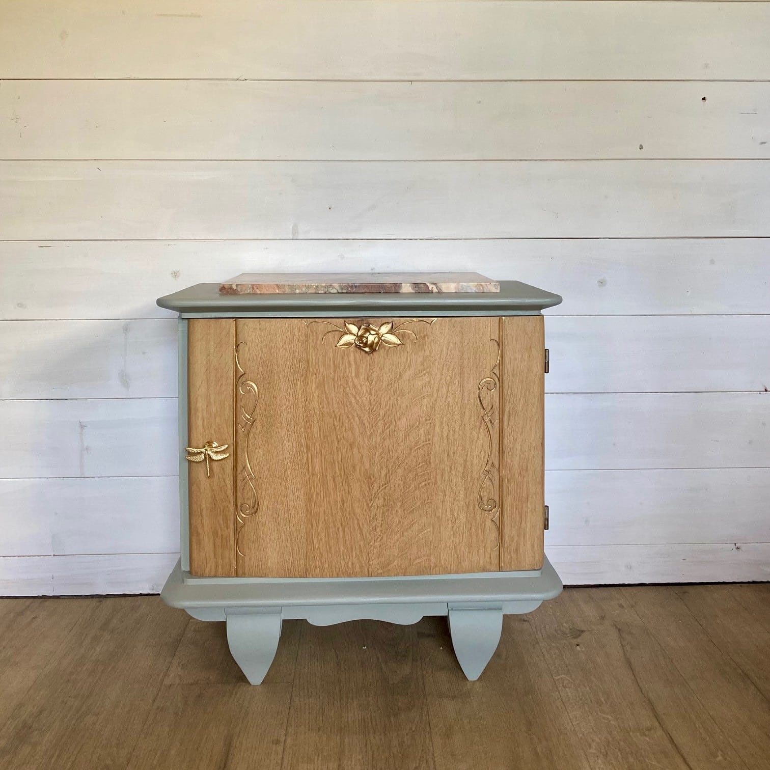Ce chevet Art déco associe le charme du bois brut à l’élégance d’un vert de gris doux. Sa poignée dorée en forme de libellule apporte une touche délicatement poétique. Un meuble de nuit parfait pour une déco vintage et raffinée.