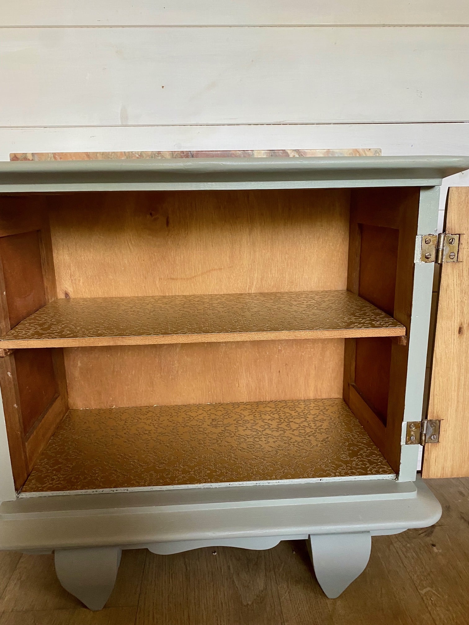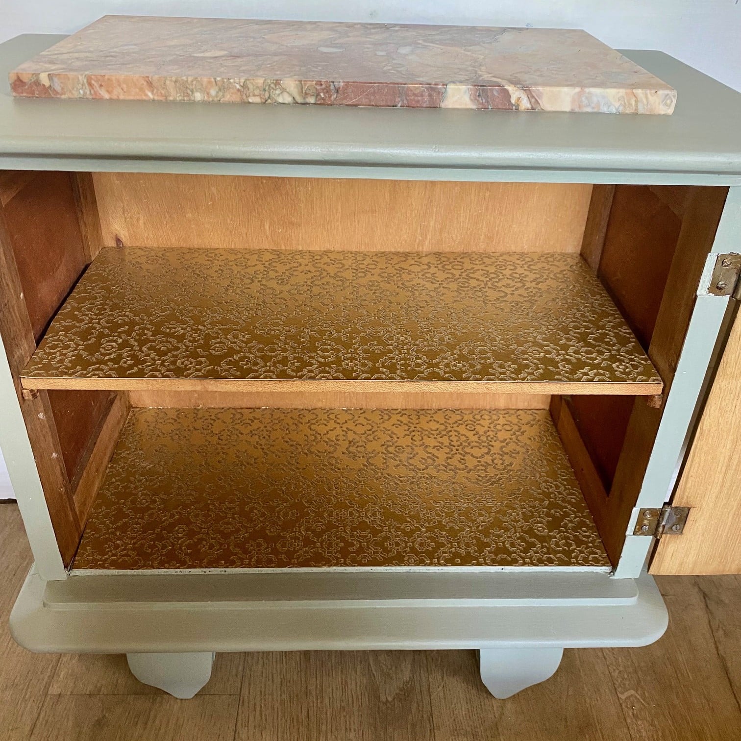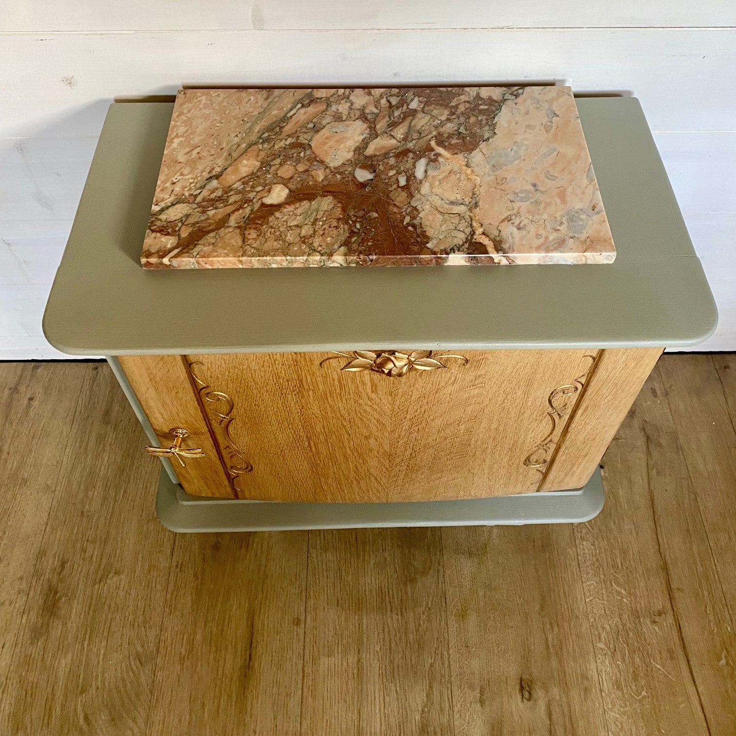 Chevet Art déco bois brut et vert de gris – Meuble de nuit vintage relooké
