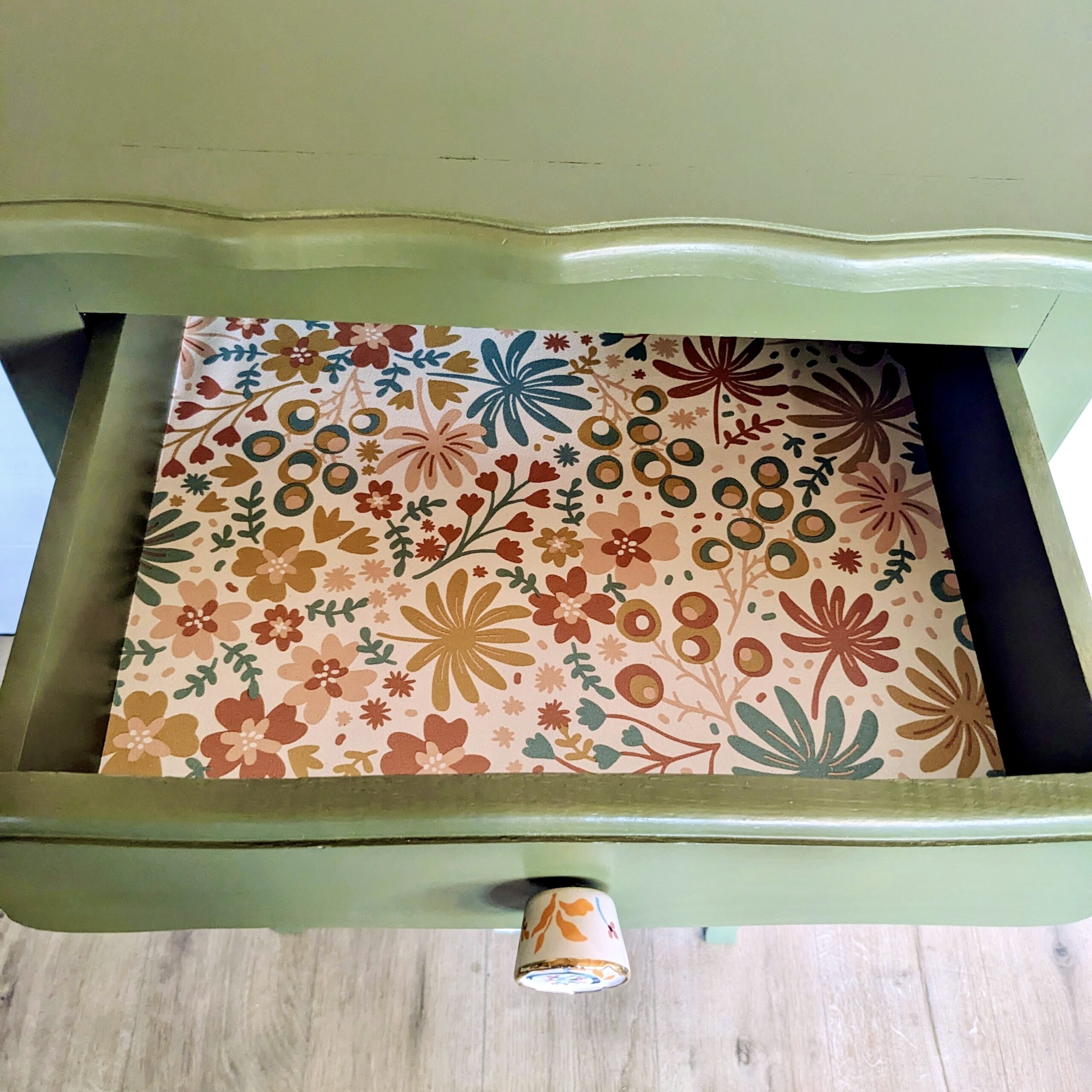 Le meuble a été entièrement repeint dans une teinte vert végétal, puis patiné pour révéler les moulures florales sculptées, subtilement mises en valeur. Les boutons de tiroirs fleuris, soigneusement sélectionnés, ajoutent une touche romantique et originale.