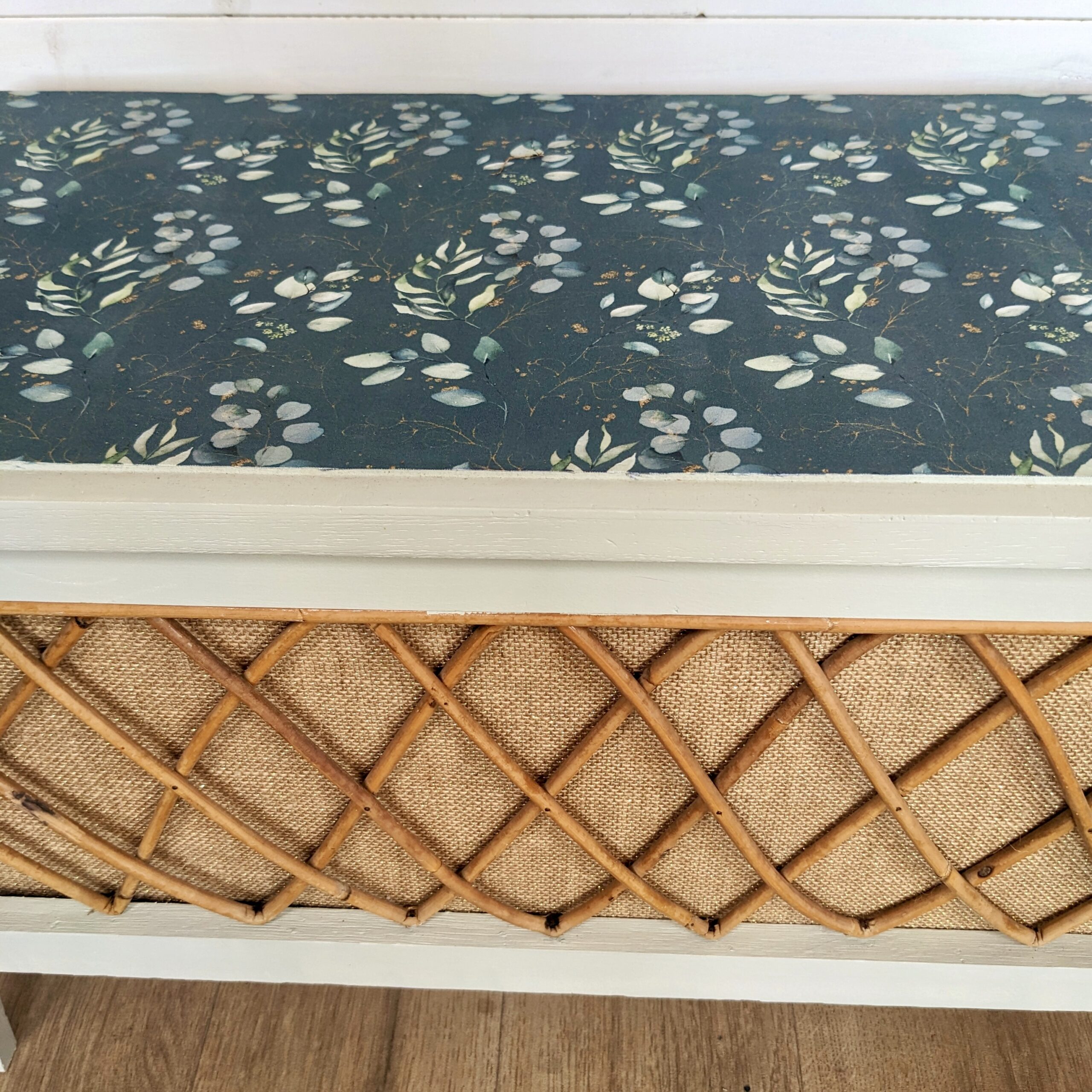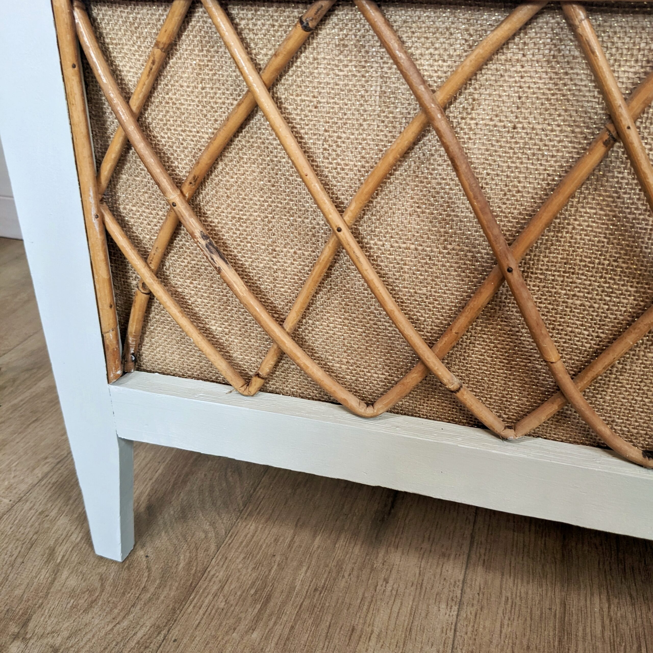 Coffre à jouets vert sauge en rotin, tissu eucalyptus