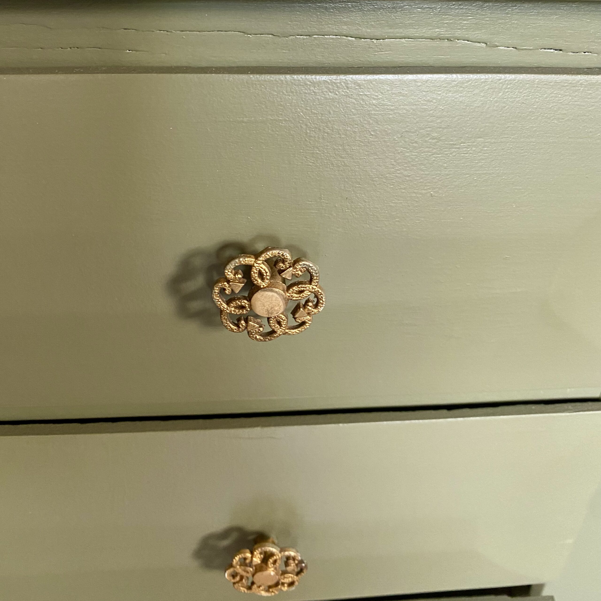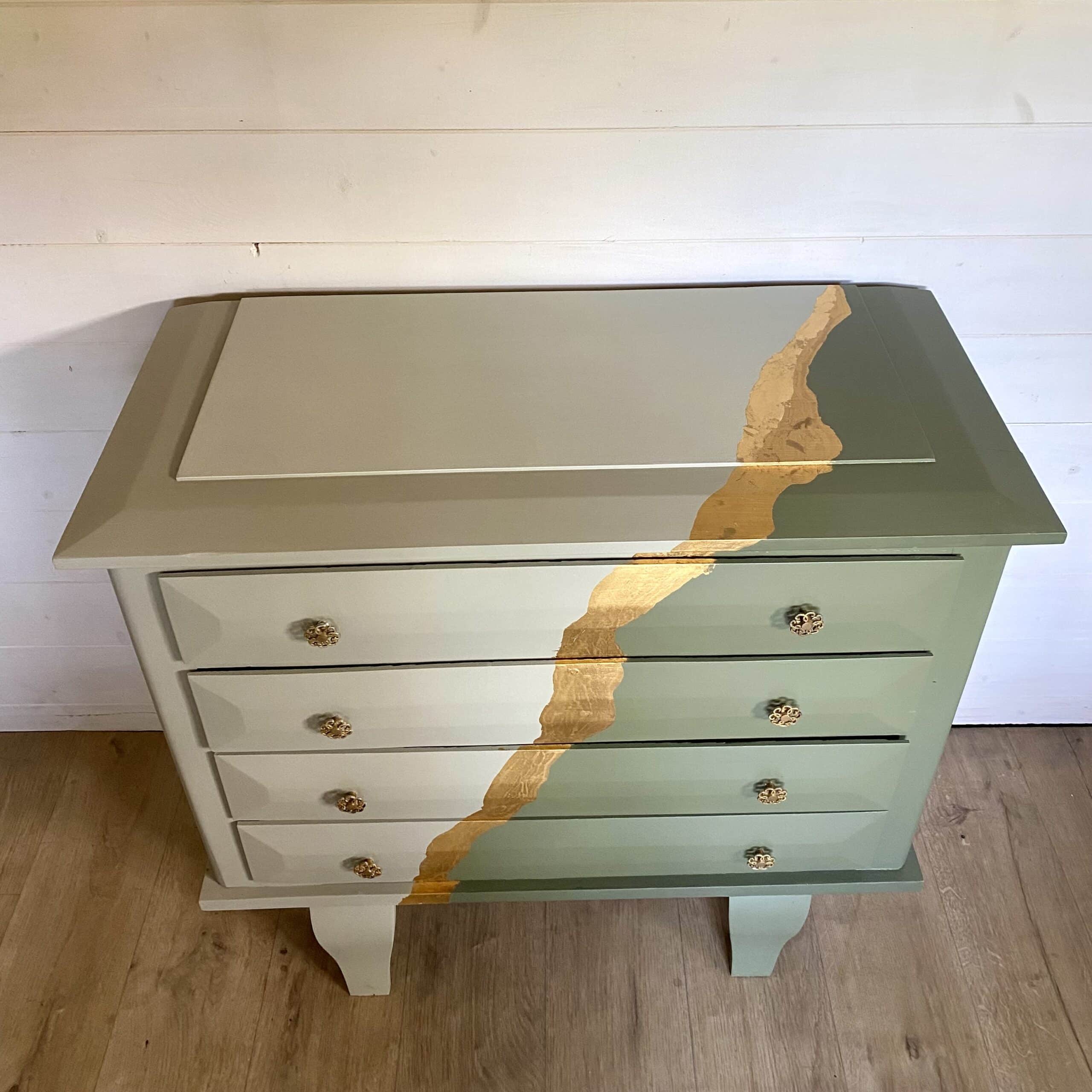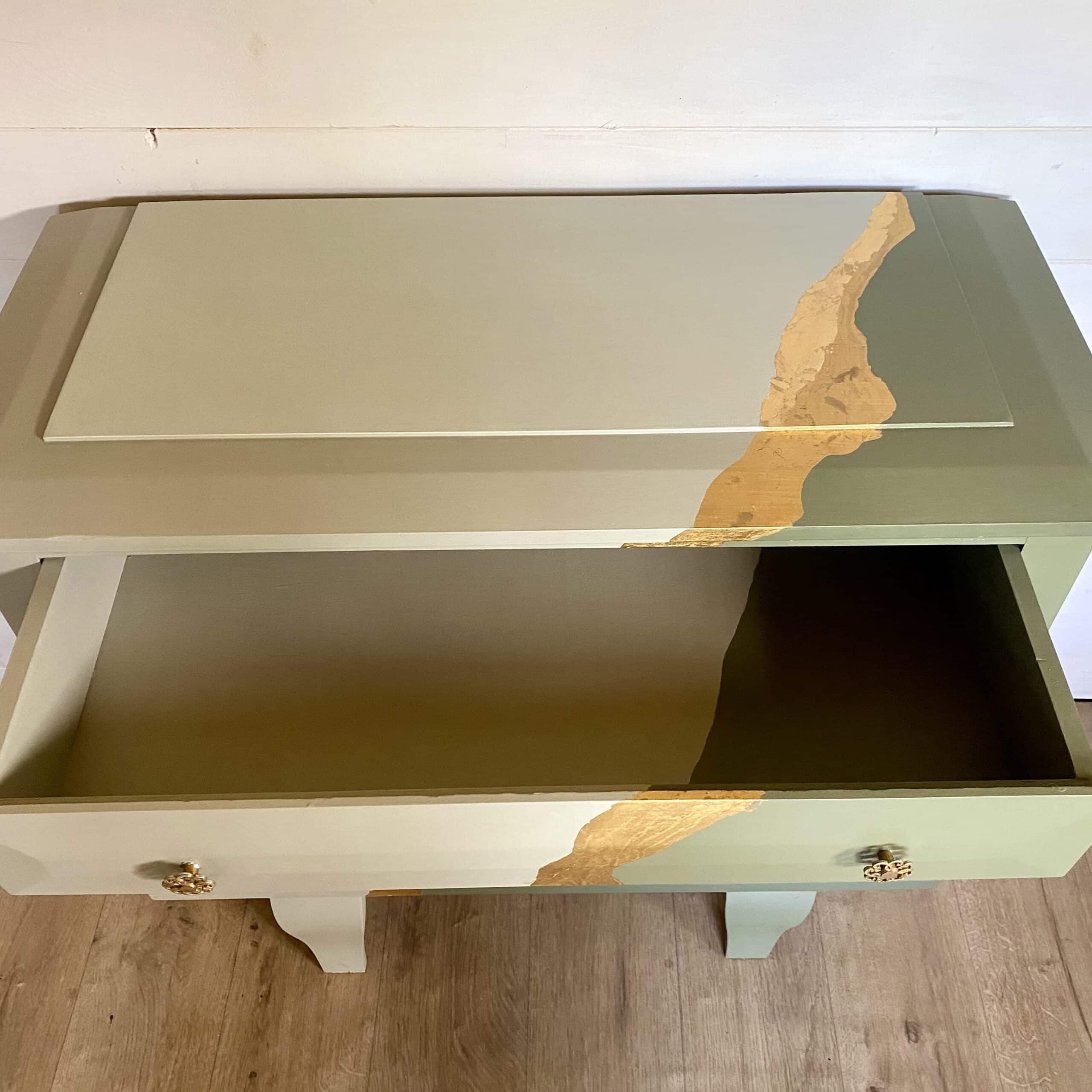 Commode en bois verte kaki et vert de gris – feuille d’or