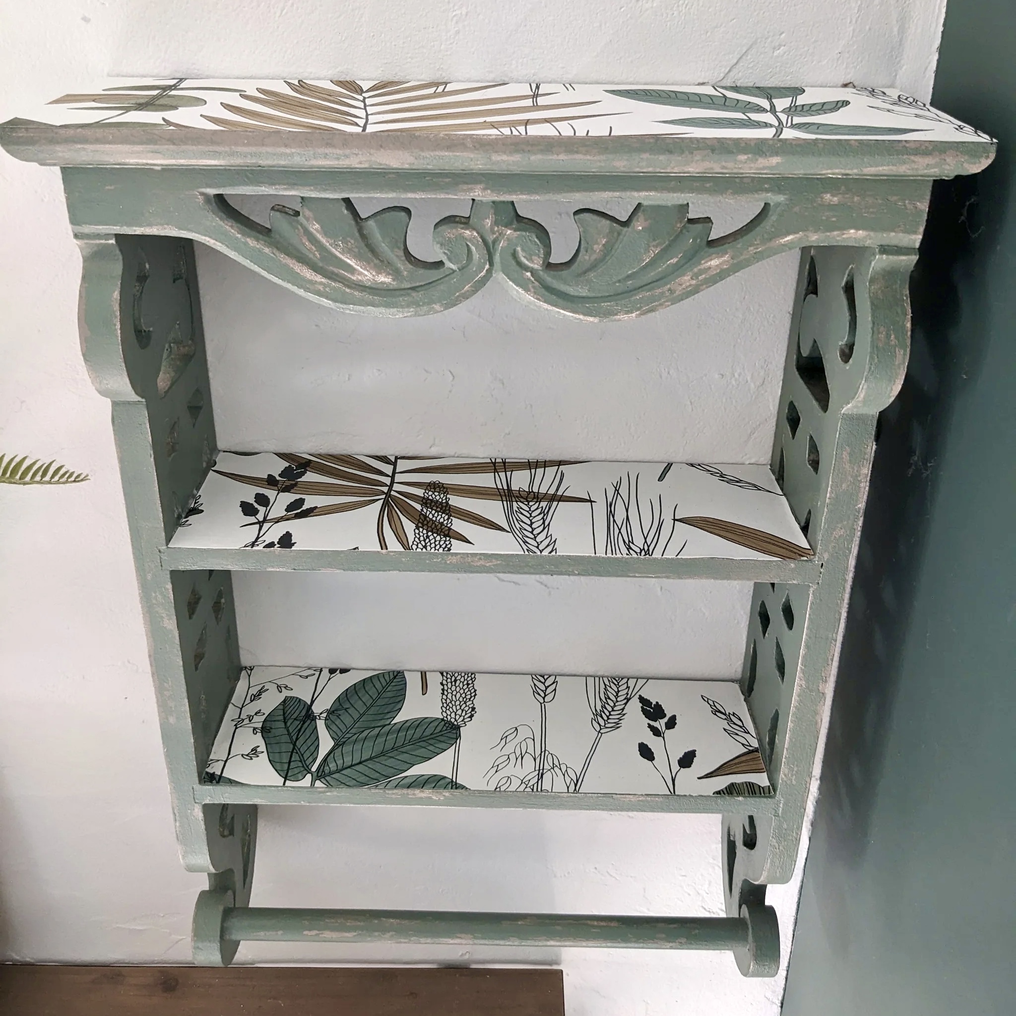 Meuble étagère murale bois sculpté et papier peint floral – Création artisanale unique