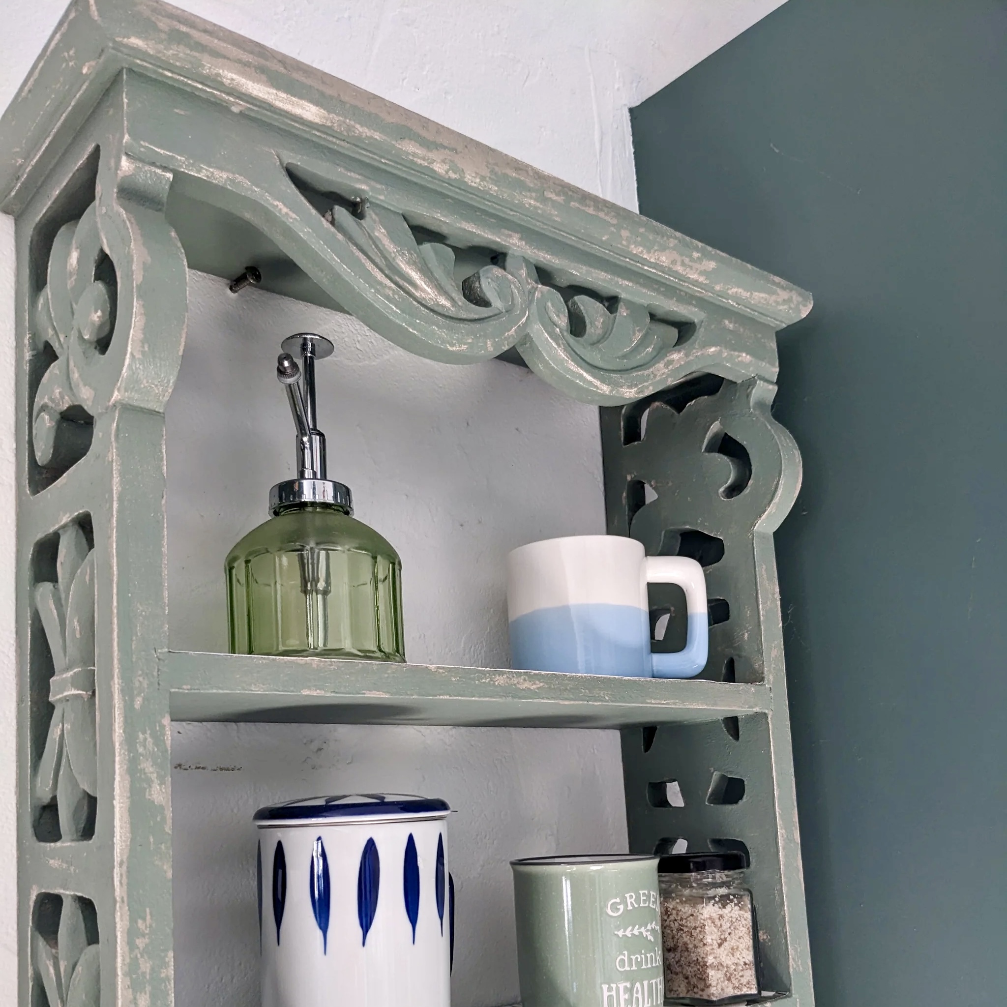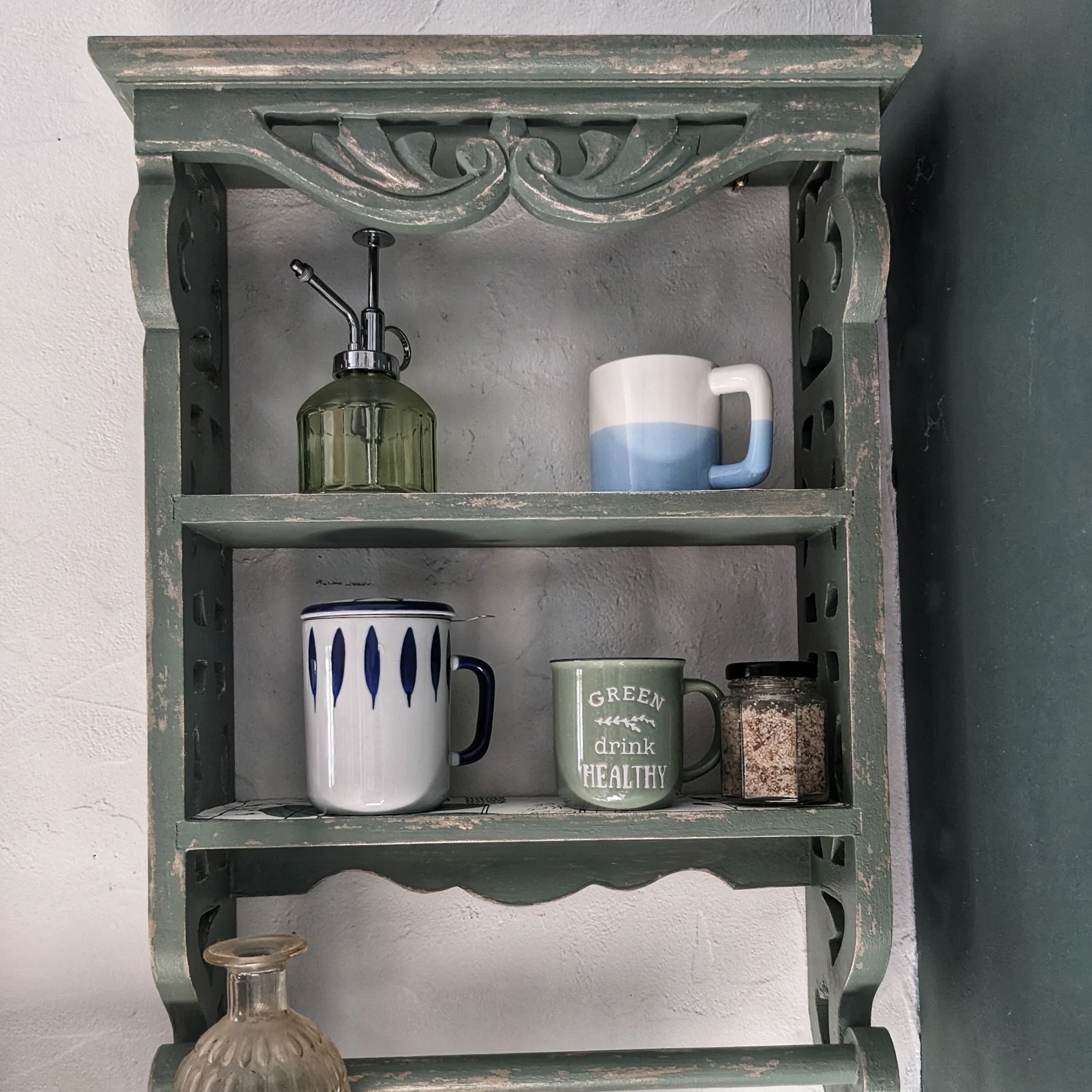 Étagère murale verte effet vieilli – Meuble mural artisanal au charme bohème vintage