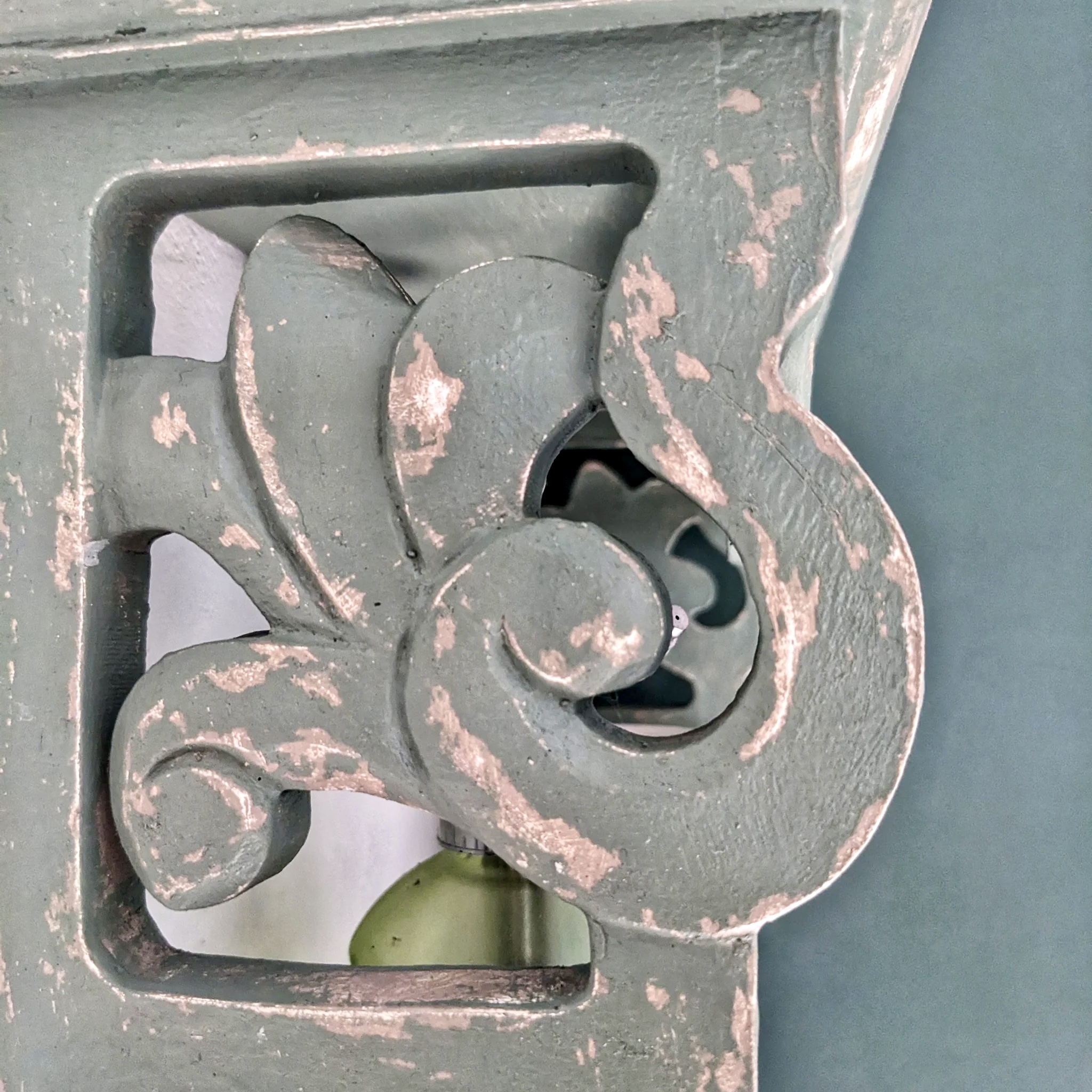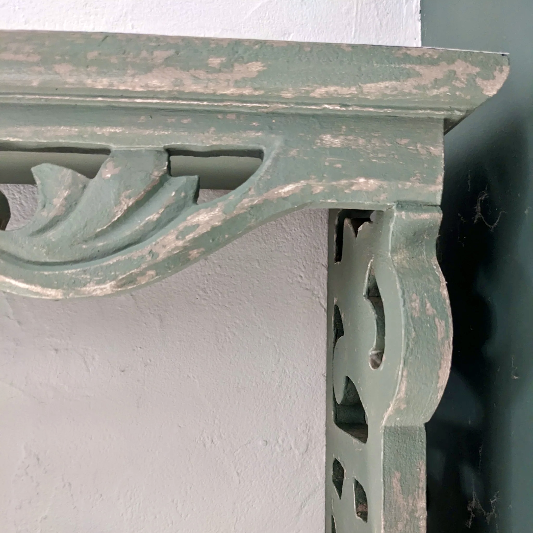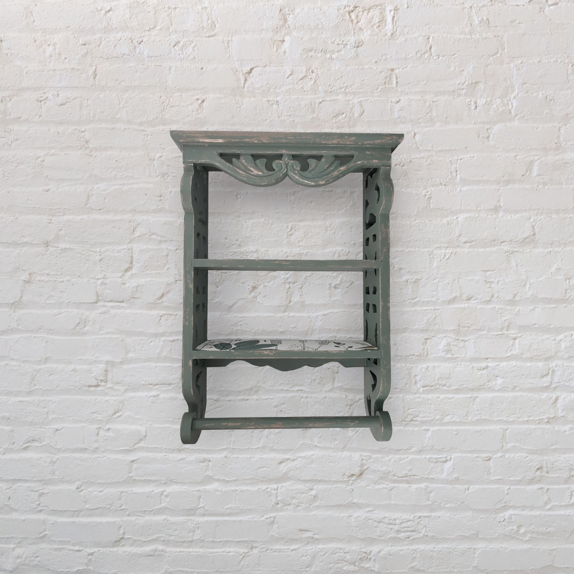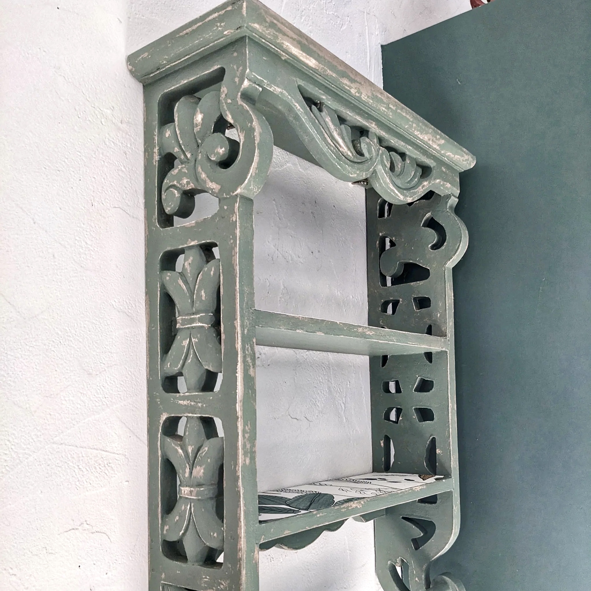 Cette étagère murale en bois vert doux séduit par ses arabesques sculptées, son effet vieilli plein de caractère et son intérieur fleuri. Un meuble mural artisanal qui allie charme d’antan et poésie végétale.