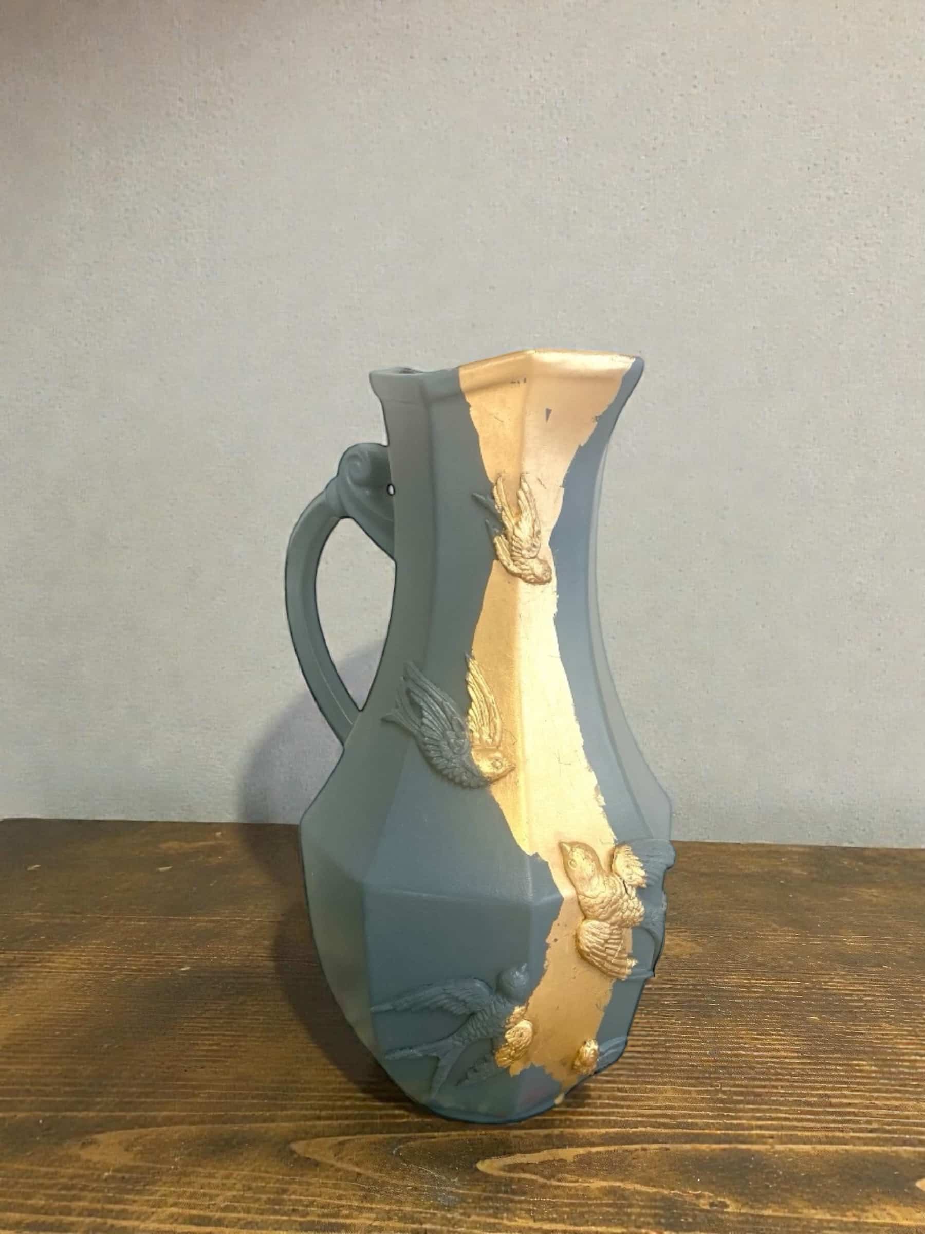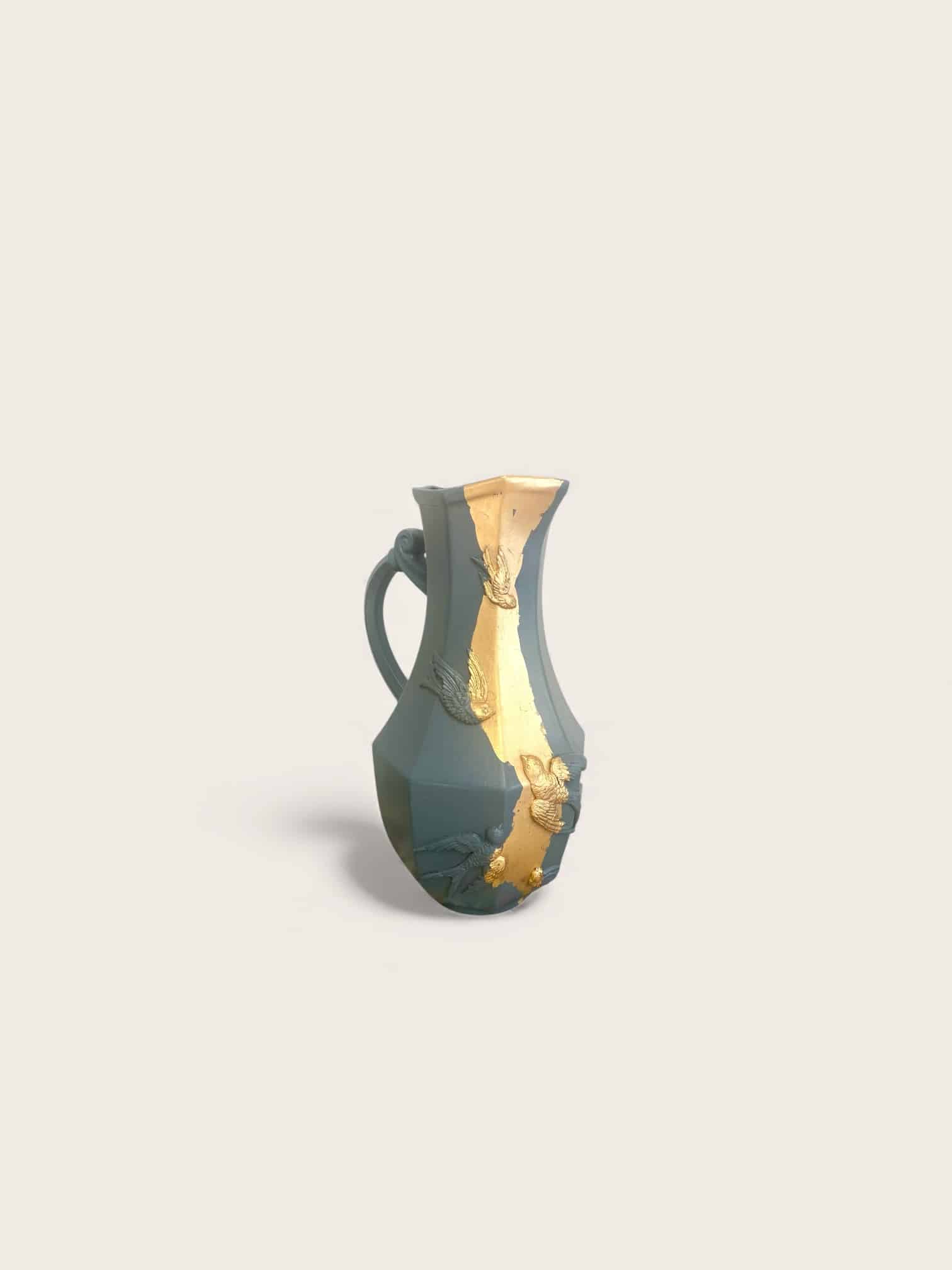 Grand pichet décoratif bleu gris avec moulures hirondelles et feuille d’or