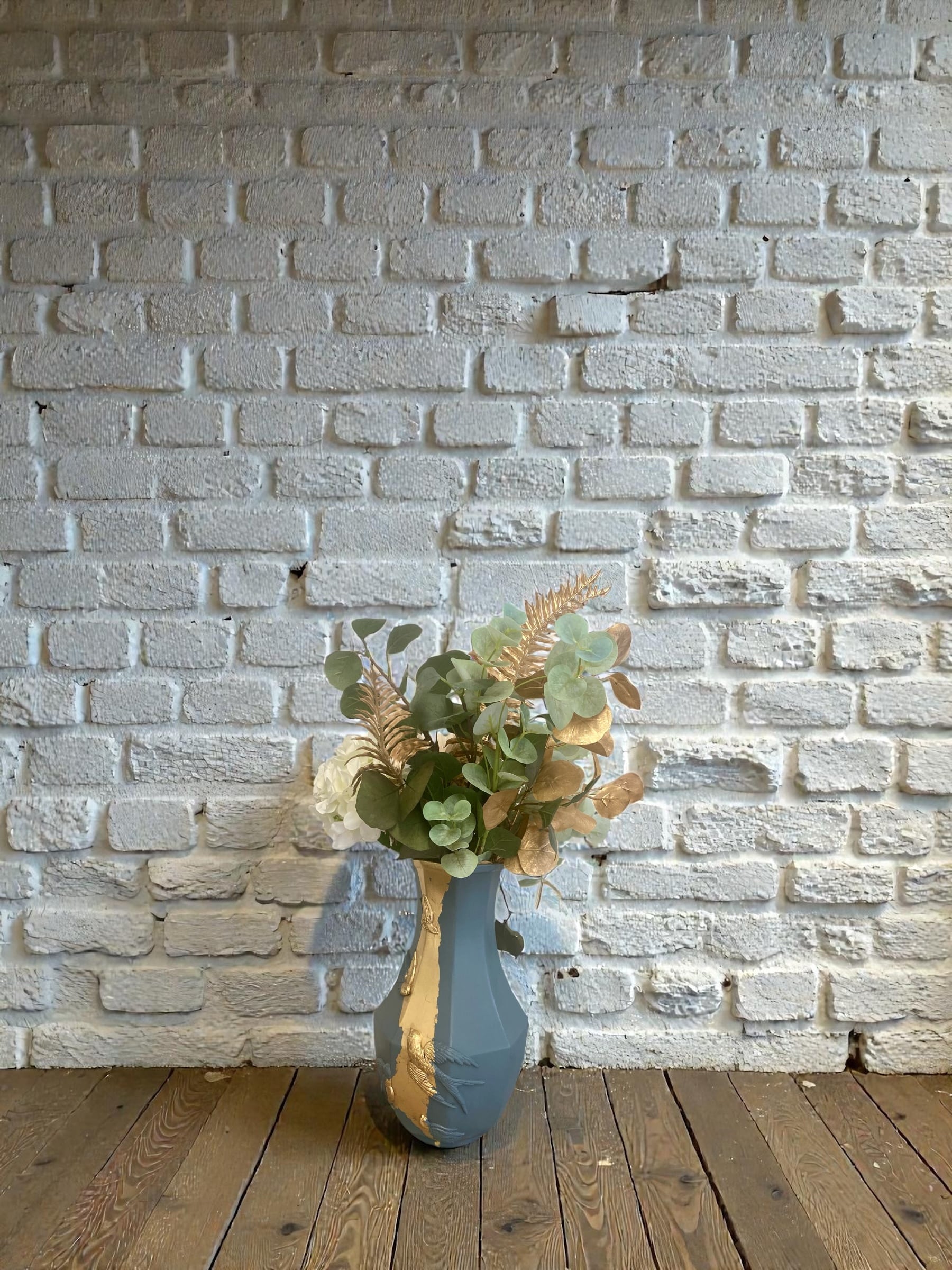 Le bleu gris, doux et profond, donne à la pièce une présence apaisante et intemporelle. Le liseré à la feuille d’or, appliqué manuellement, vient souligner les lignes du pichet et capter la lumière avec subtilité, sans excès.