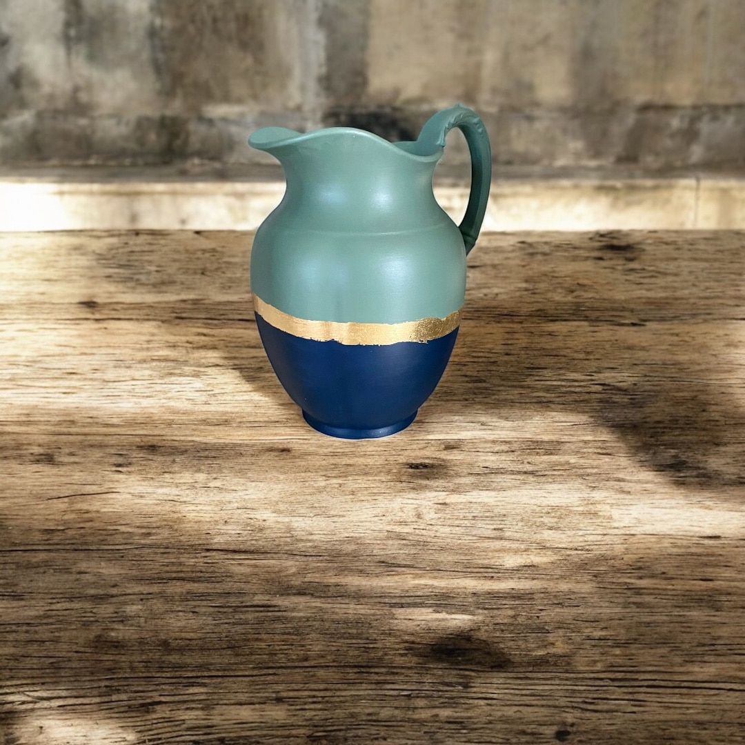 Grand pichet vert et bleu marine avec liseré doré. Pièce unique revalorisée à la main près de Toulouse.