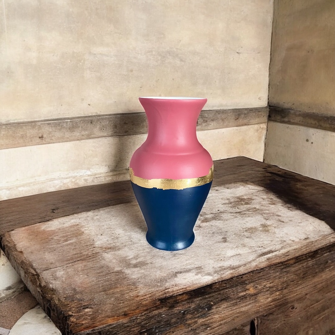 Vase décoratif rose et bleu marine avec feuille d’or – pièce unique artisanale