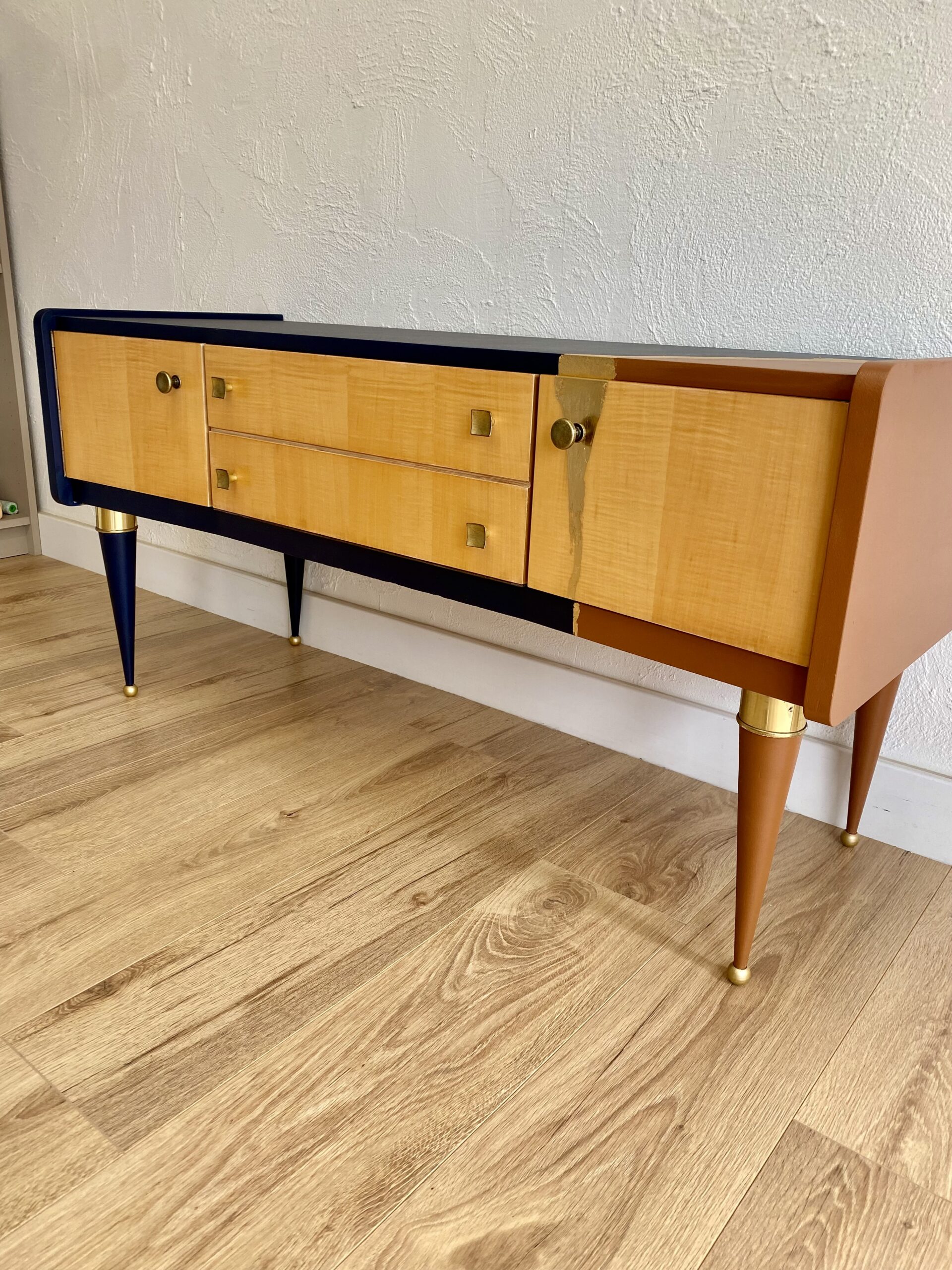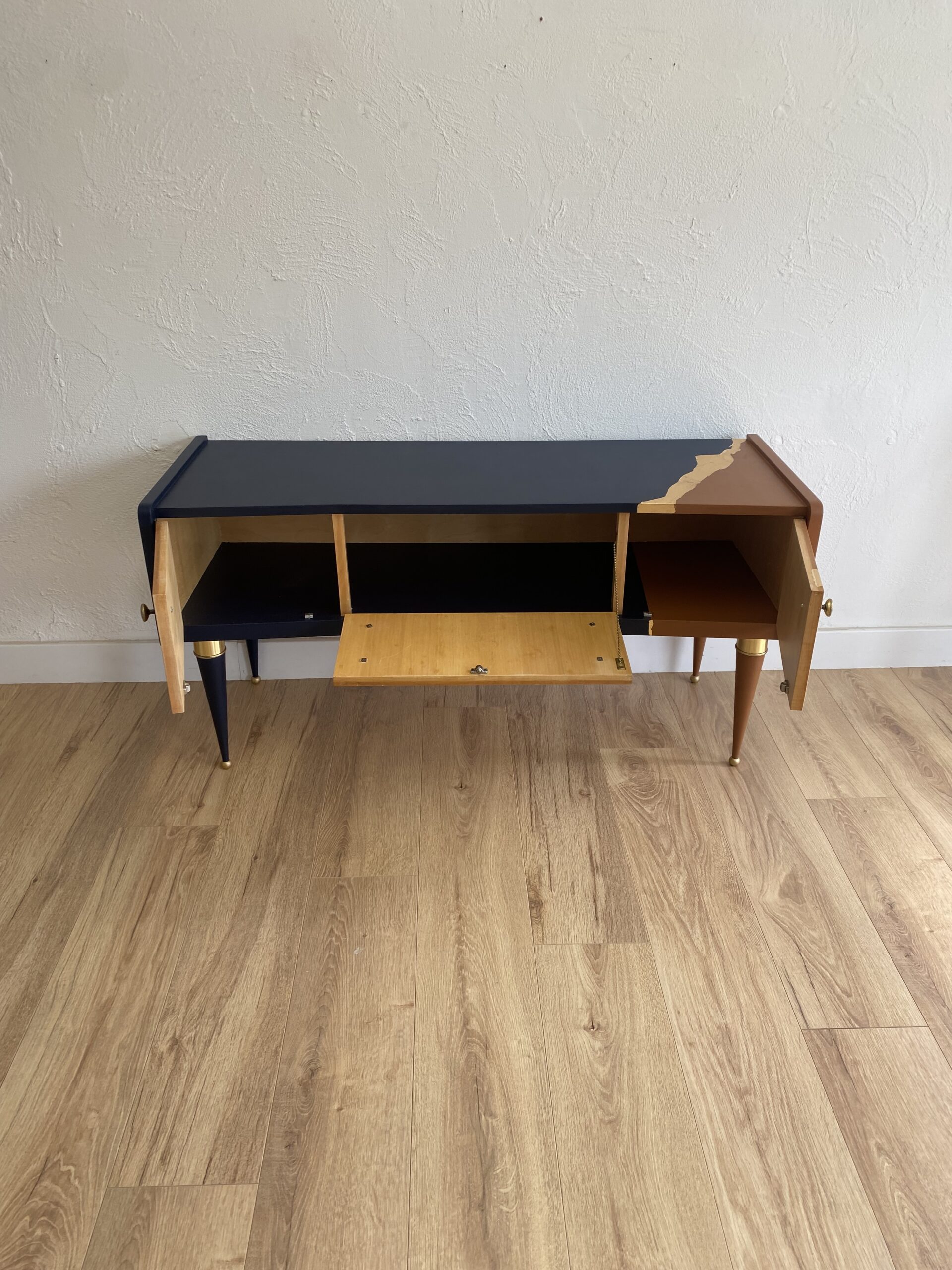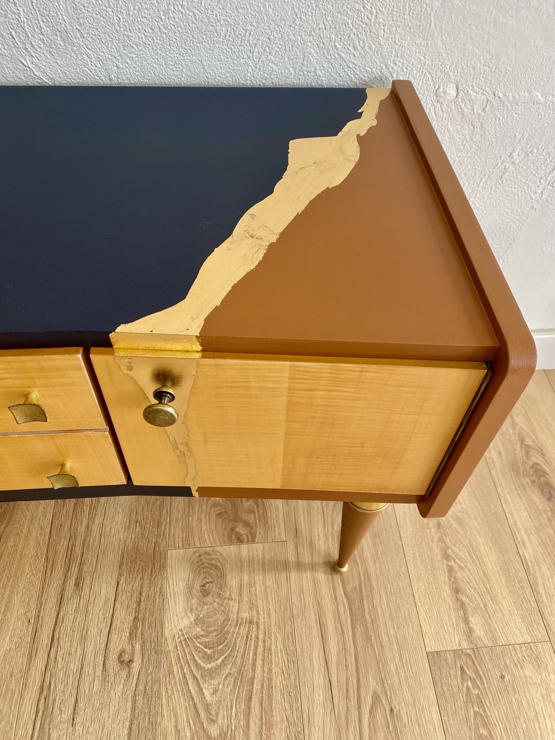 Meuble vintage relooké bleu marine, terracotta et feuille d’or – Style mid-century revisité