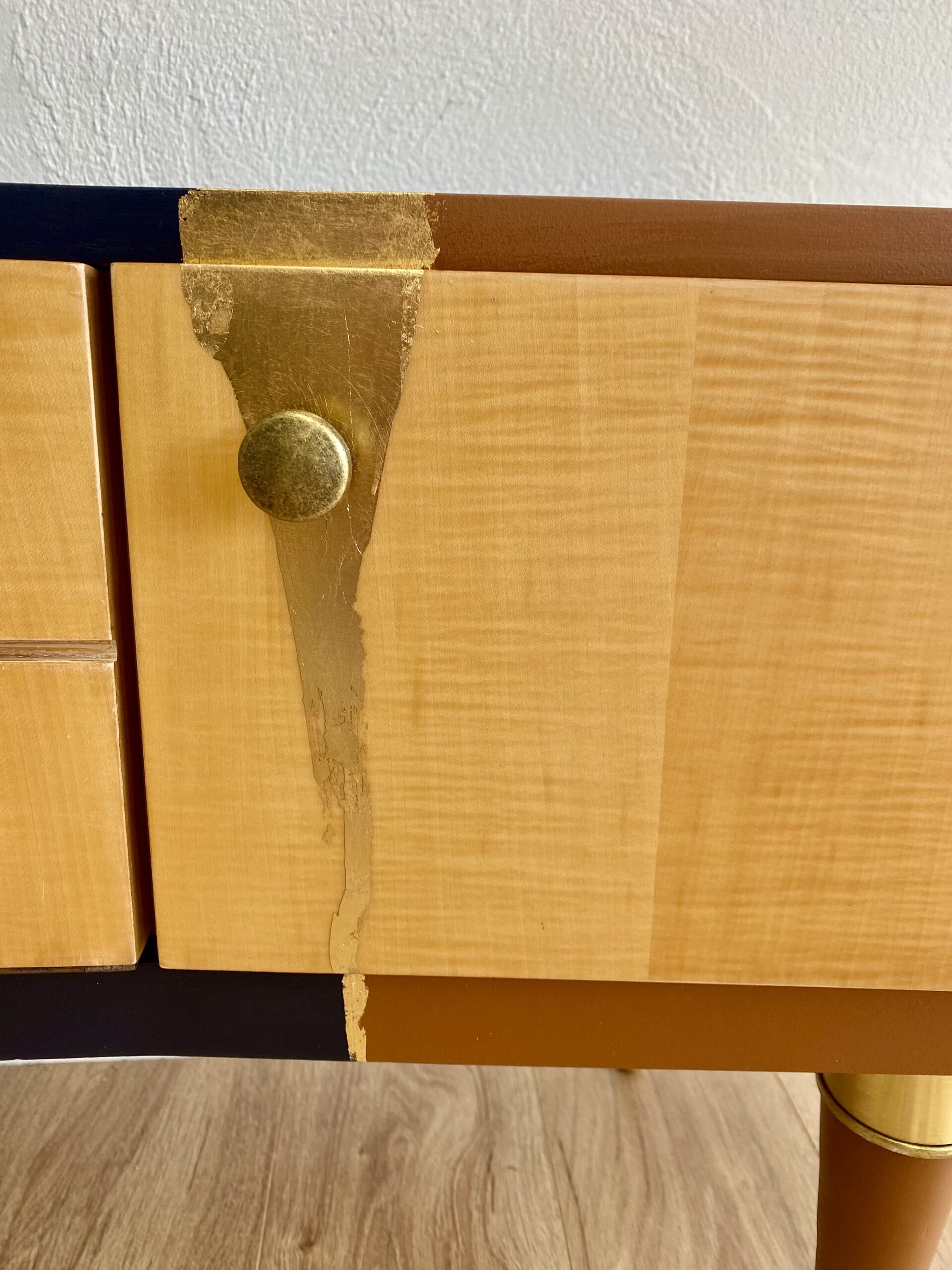 Meuble vintage relooké à la main en bleu marine et terracotta, avec bois remis à nu et protégé, sublimé par une ligne en feuille d’or.