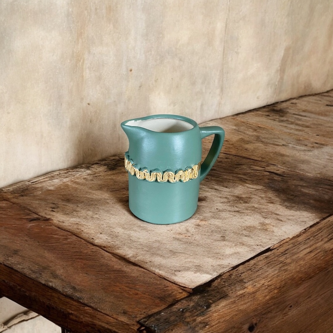 Petit pichet vert entièrement revalorisé, orné d’une moulure décorative et d’un liseré doré en feuille d’or.