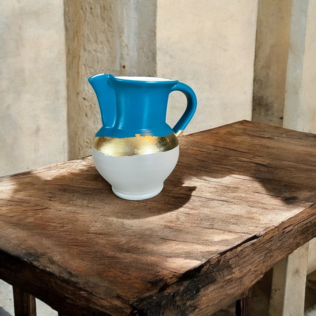 Pichet bleu canard et beige avec finition feuille d’or – pièce unique et artisanale