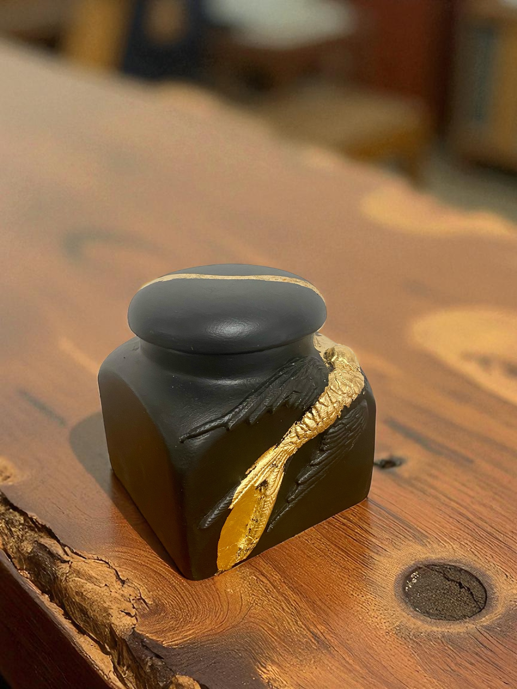 Petit pot décoratif noir et doré avec moulures oiseaux – pièce artisanale unique