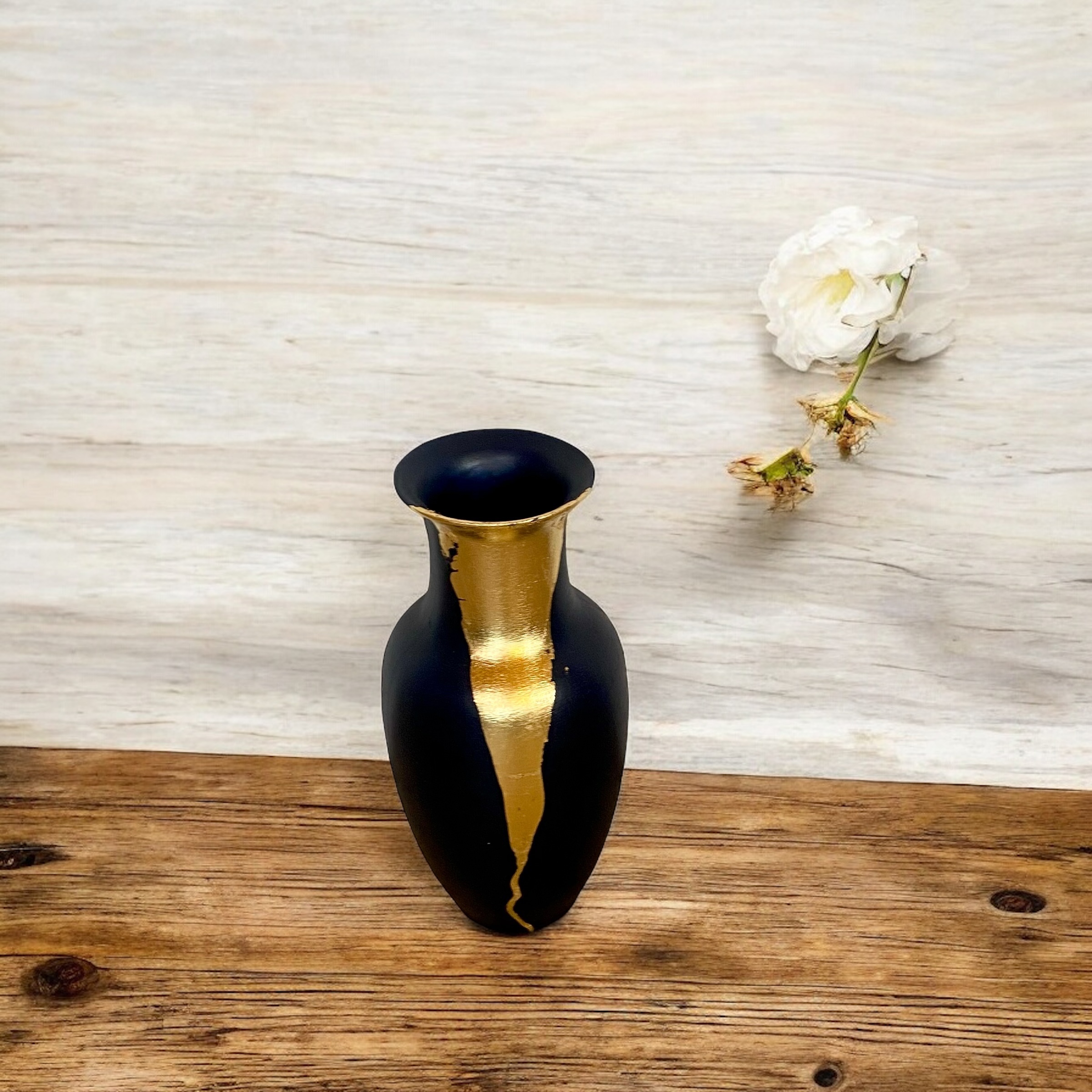 Petit vase bleu nuit, relooké à la main avec une touche de feuille d’or, pour une déco élégante et raffinée.