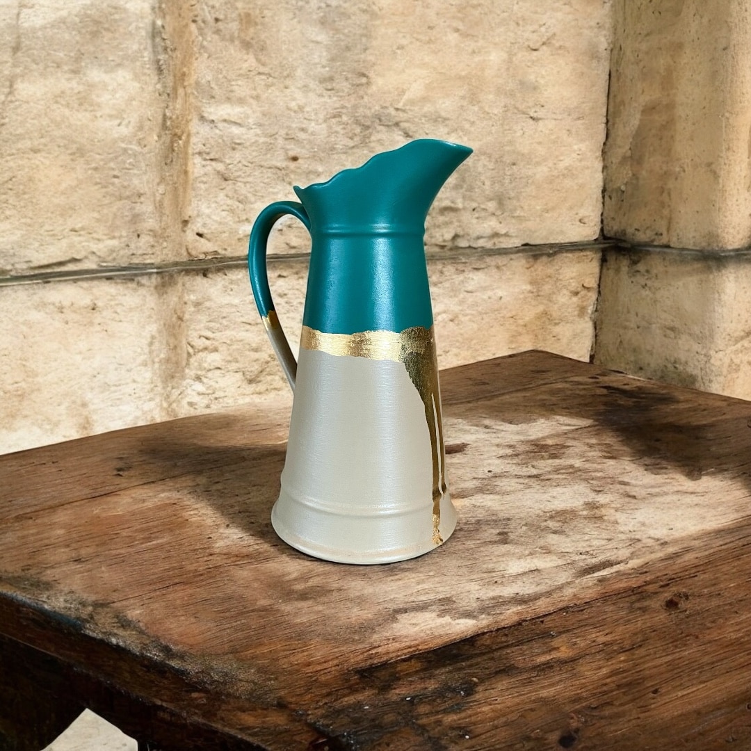 Apportez une touche d’élégance à votre intérieur avec ce vase beige et vert relooké à la main et orné d’un délicat liseré de feuille d’or.