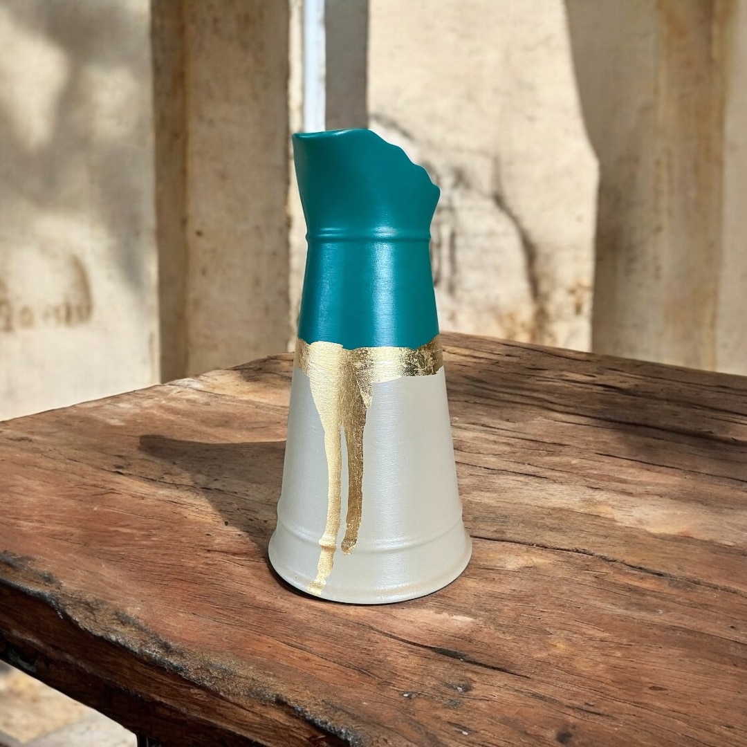 Vase beige et vert relooké à la feuille d’or – Élégance minimaliste