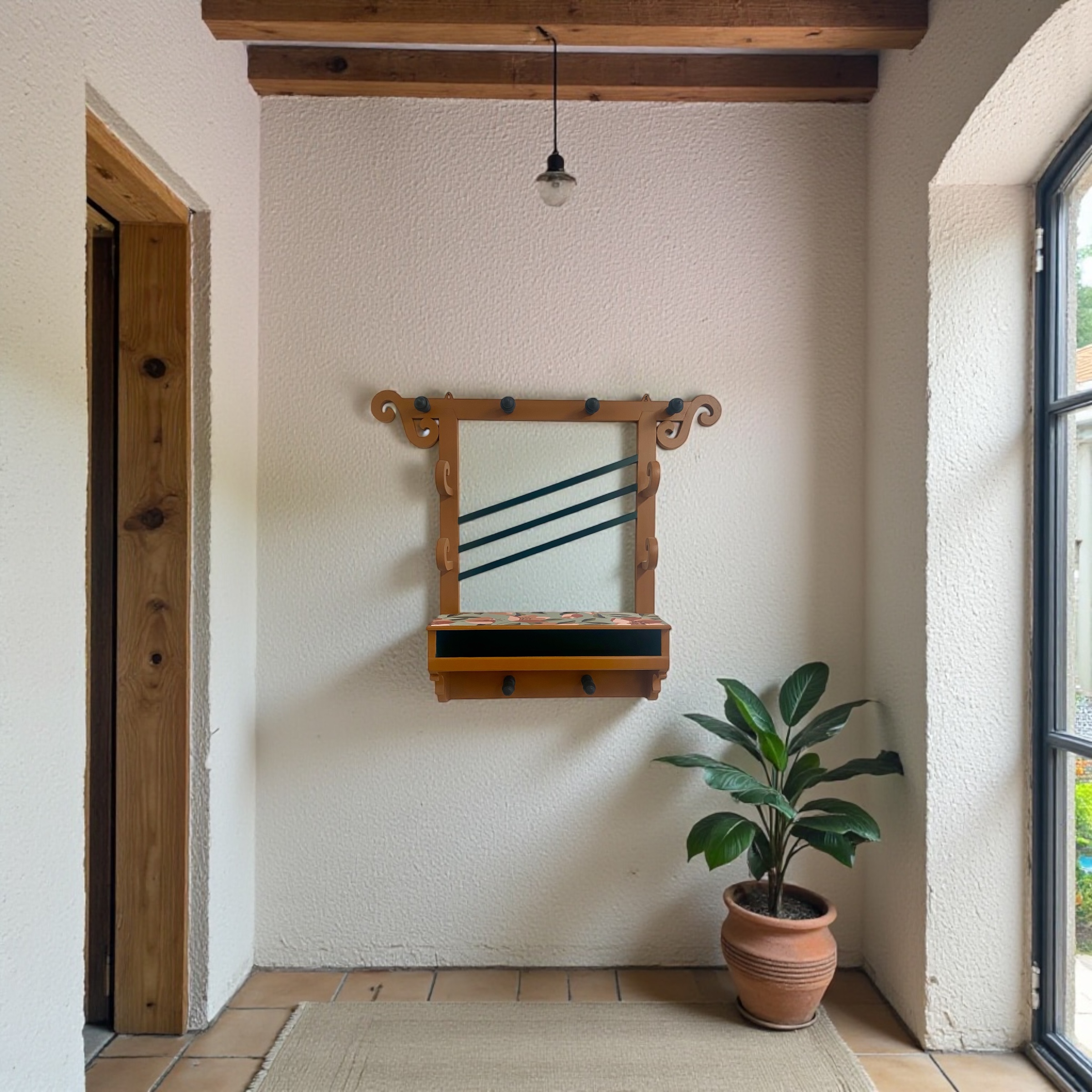 Ancien porte-manteau mural entièrement relooké à la main dans des tons terracotta et vert bouteille, sublimé par un papier peint fleuri.
