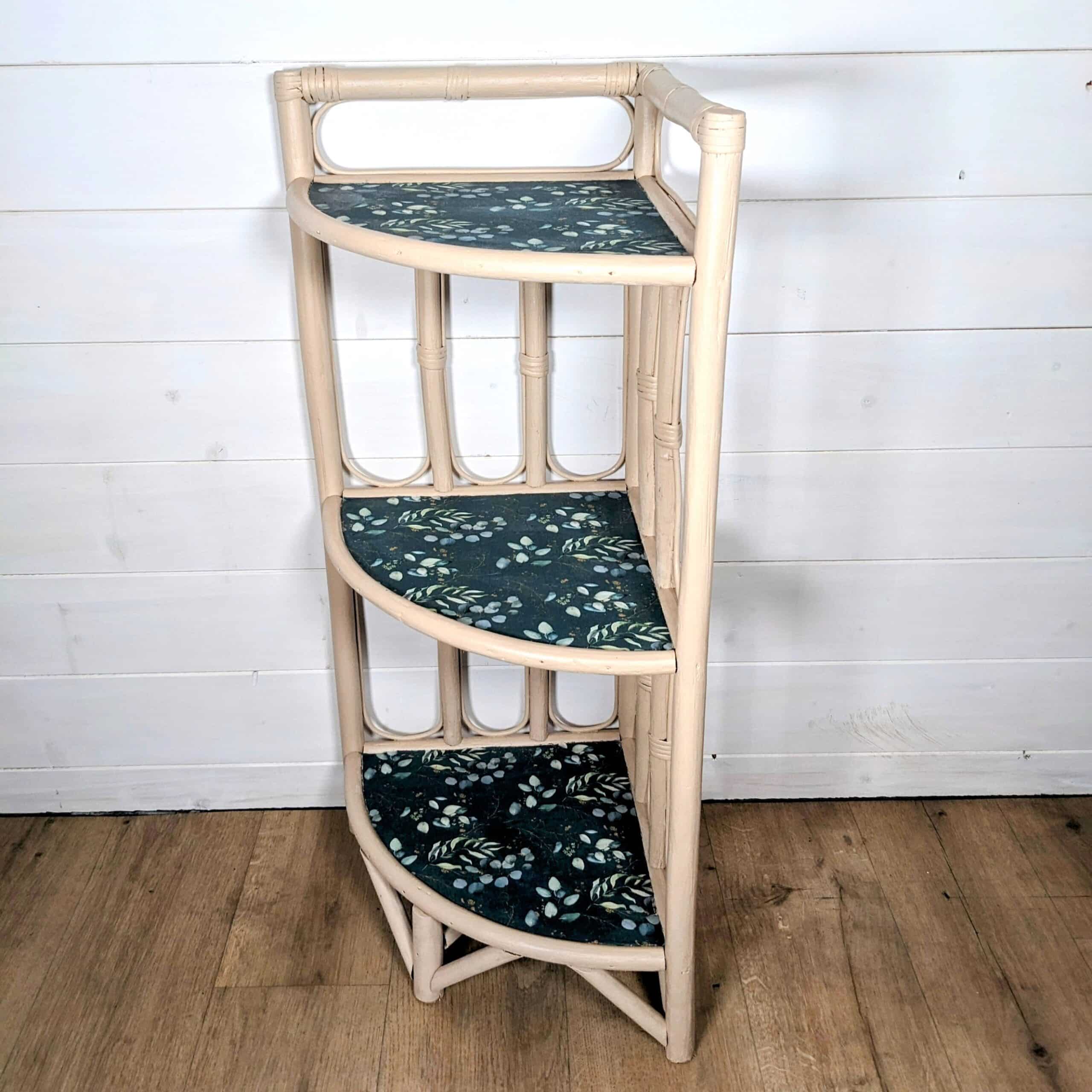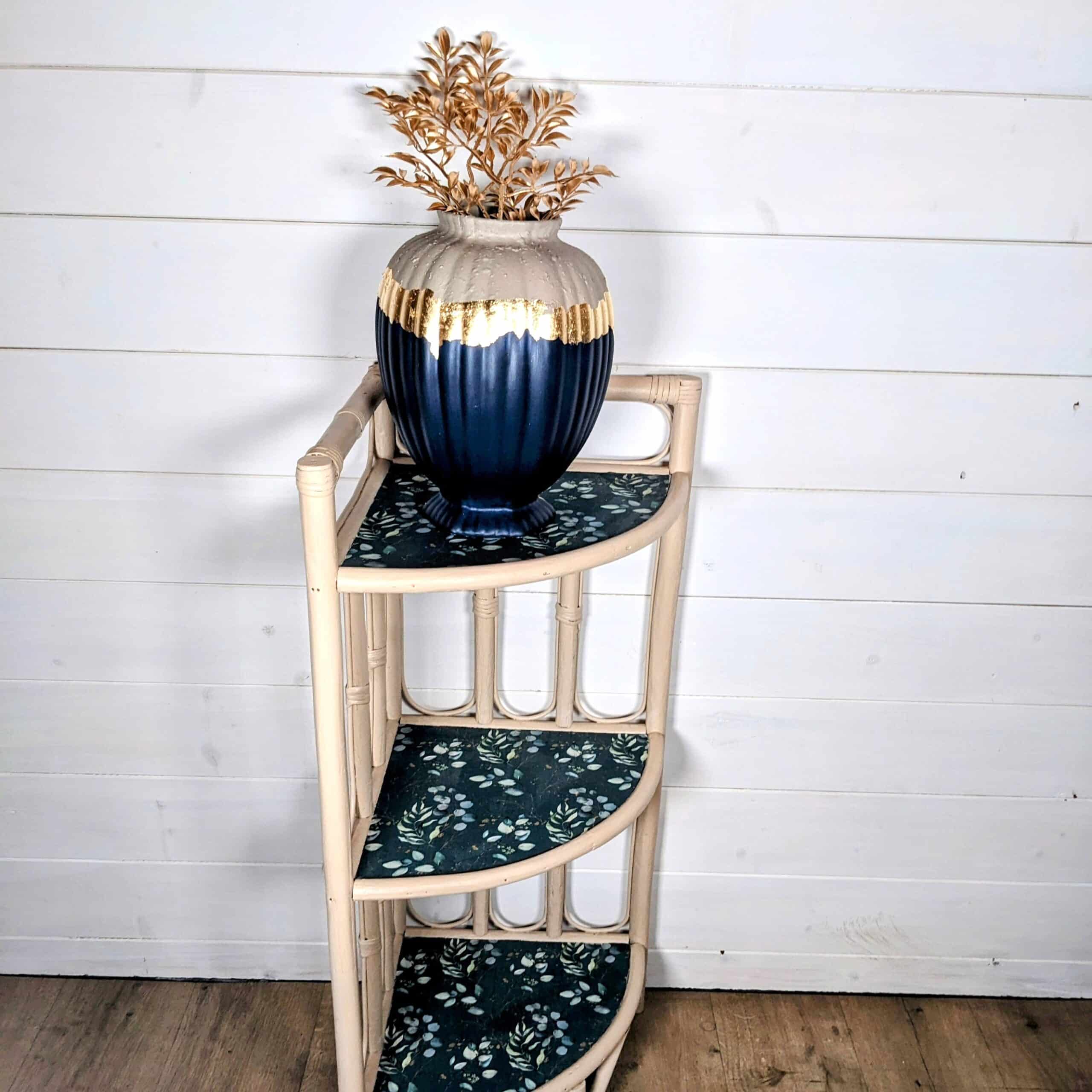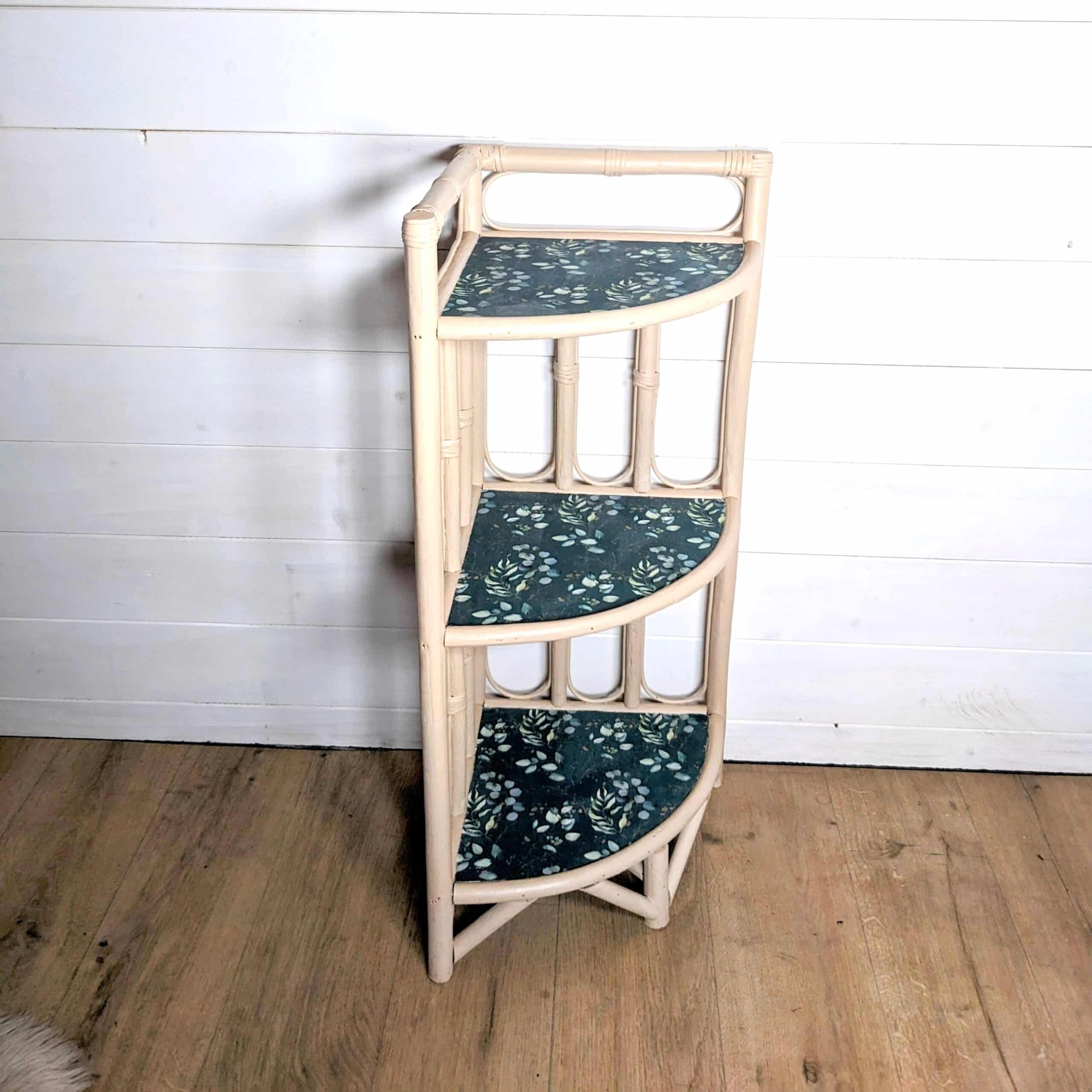 Offrez une seconde vie à vos angles oubliés avec cette console d’encoignure vintage. Entièrement repensée dans mon atelier à Castelginest, cette pièce mêle la chaleur naturelle du rotin sable à la fraîcheur végétale d’un tissu eucalyptus délicatement protégé pour un usage quotidien.