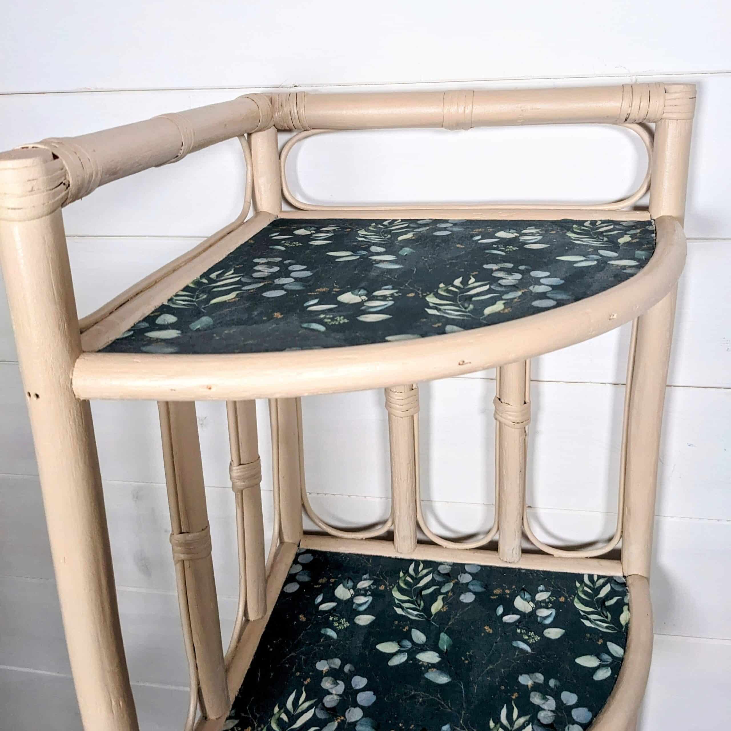 Table d’encoignure en rotin sable et tissu eucalyptus – Meuble d’angle vintage