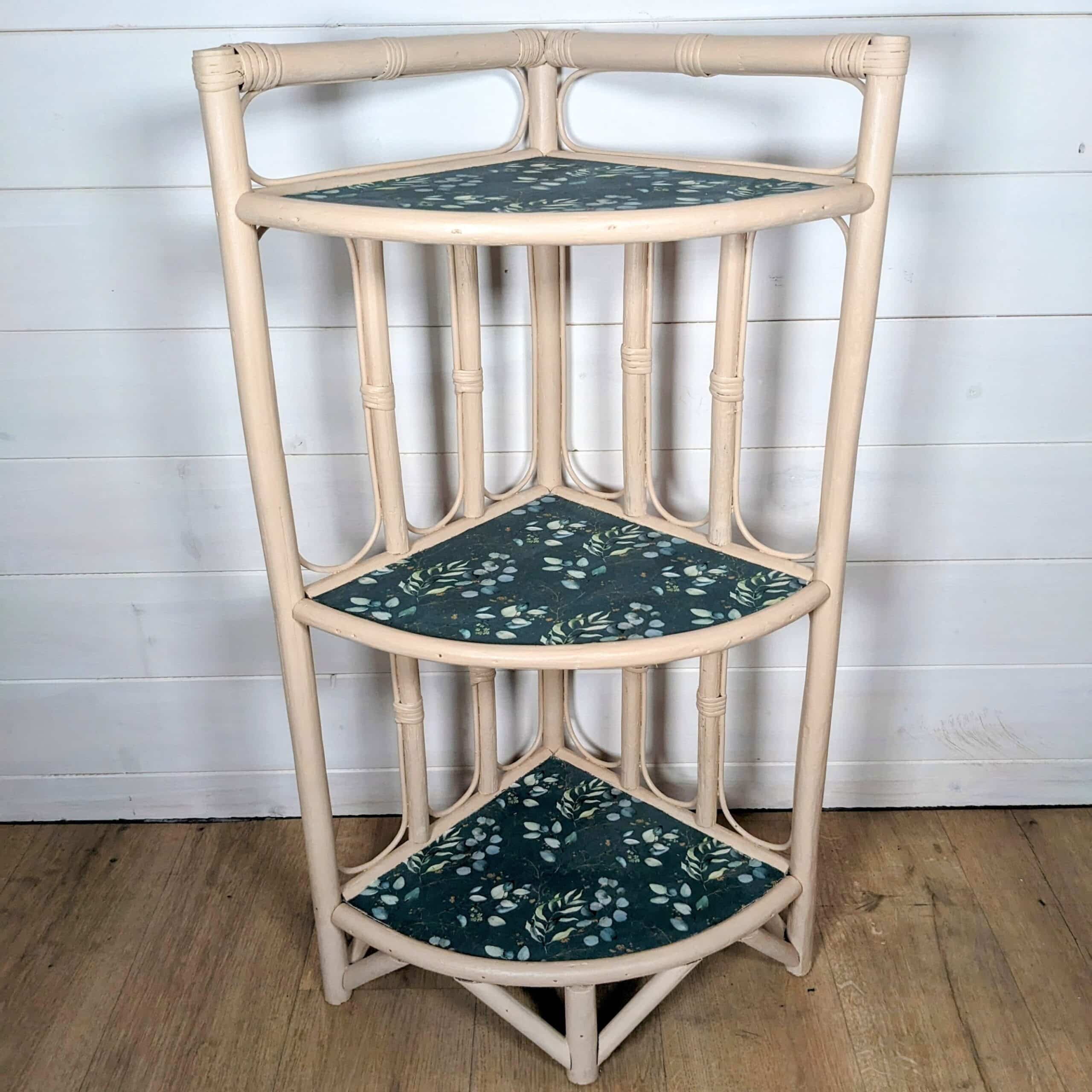 Cette console d’encoignure en rotin, subtilement relookée en sable clair avec un tissu eucalyptus doux, est idéale pour habiller un coin vide avec charme et légèreté. Parfaite pour une entrée, un salon ou une chambre au style bohème.