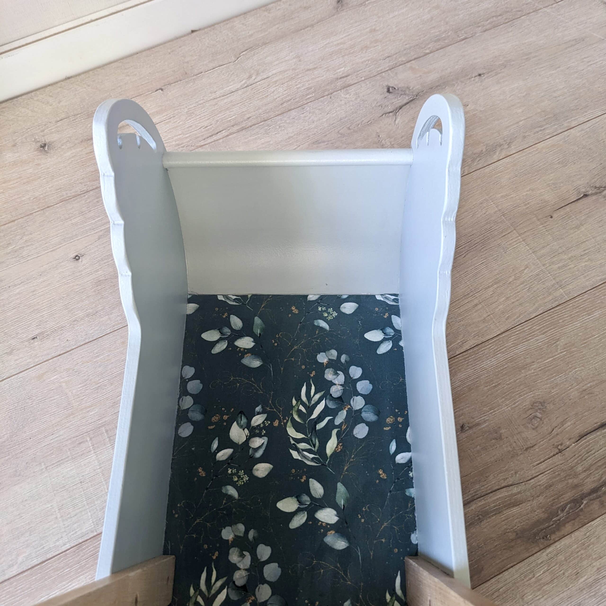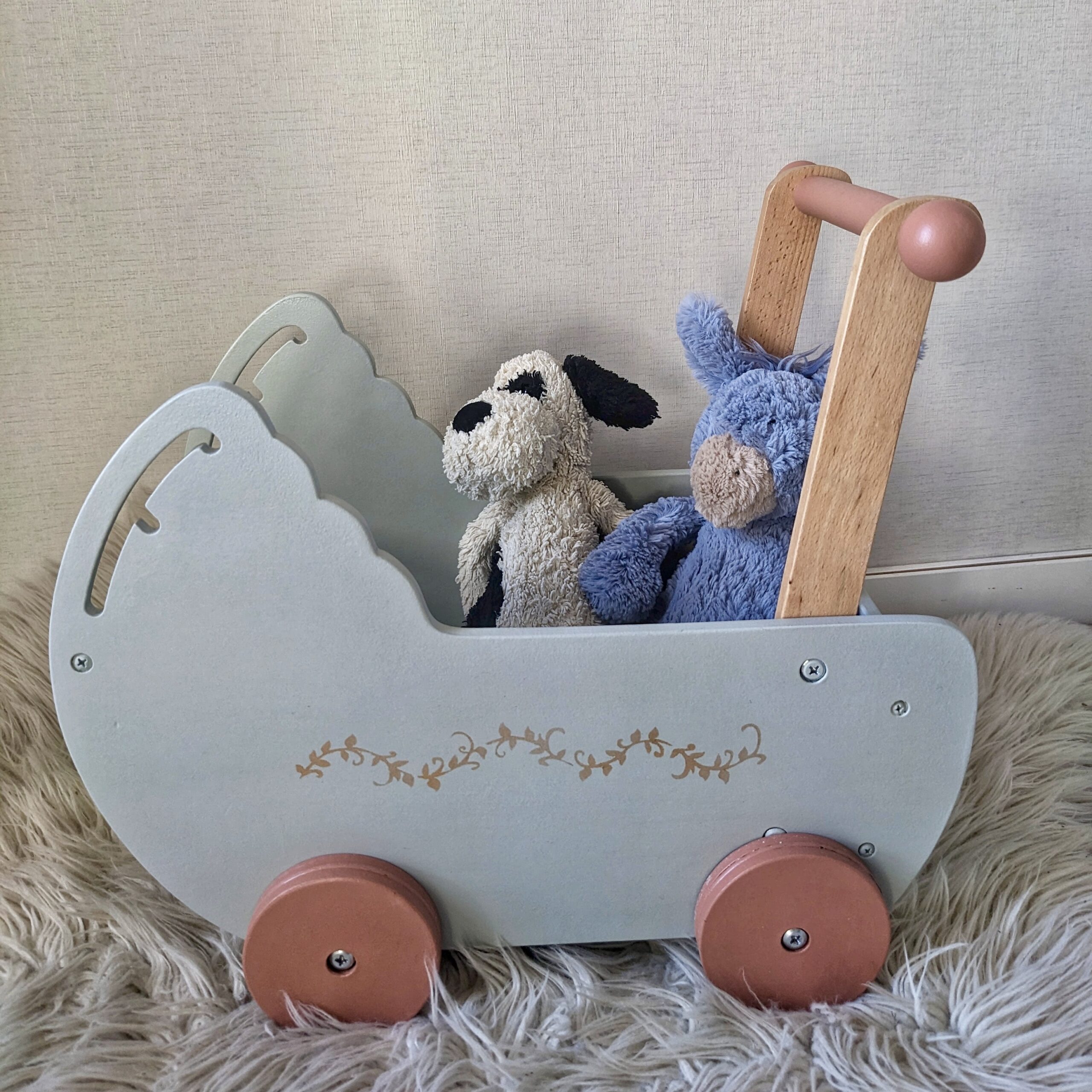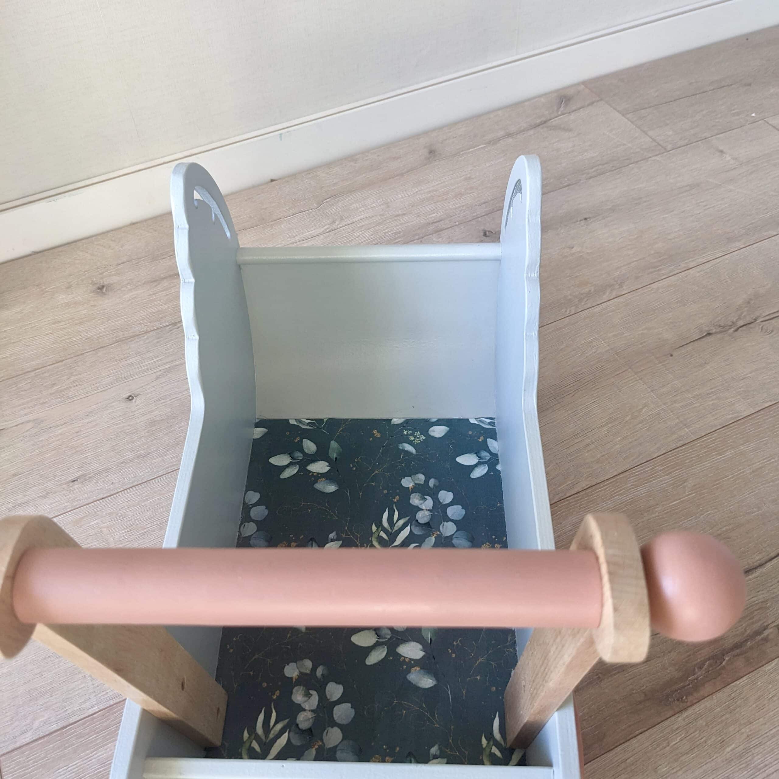 Ce trotteur en bois vert de gris a été relooké à la main dans mon atelier avec une touche élégante de pochoir doré pour lui offrir un look à la fois raffiné et ludique. Conçu pour accompagner les premiers pas des enfants, il est aussi une pièce décorative pleine de charme pour leur chambre.