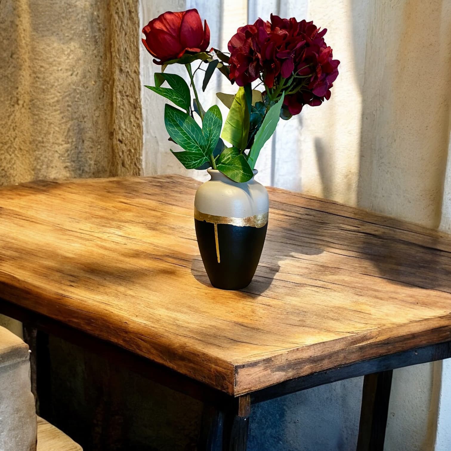 Le contraste saisissant entre le beige apaisant et le noir profond est mis en valeur par un liseré en feuilles d’or délicatement appliqué à la main. Polyvalent et raffiné, ce vase s’intègre aussi bien dans une décoration contemporaine, minimaliste ou raffinée. Il saura magnifier vos bouquets – qu’ils soient frais ou séchés – ou se suffire à lui-même comme pièce décorative.