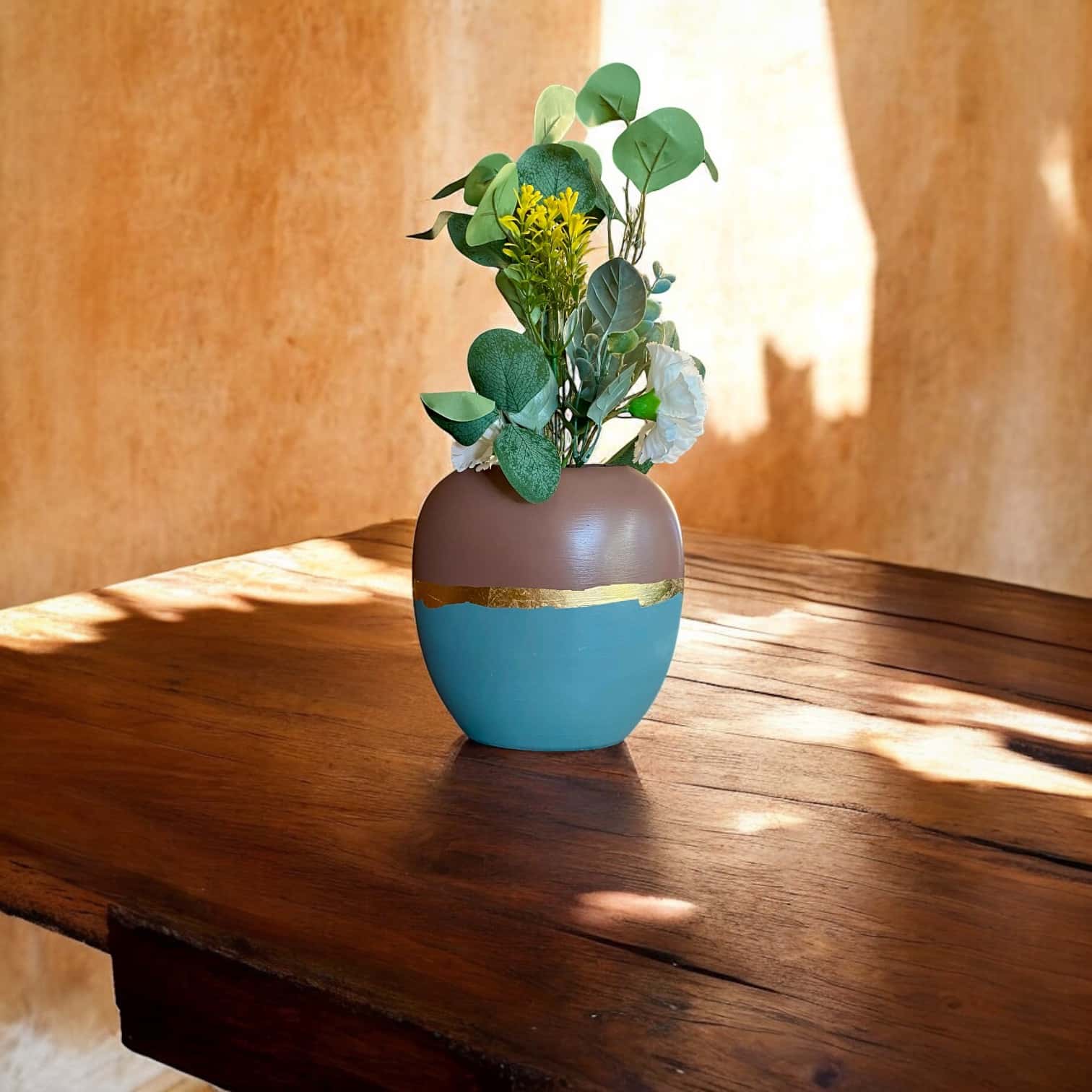 Vase gris bleu et marron relooké avec détail doré – Artisanat écoresponsable