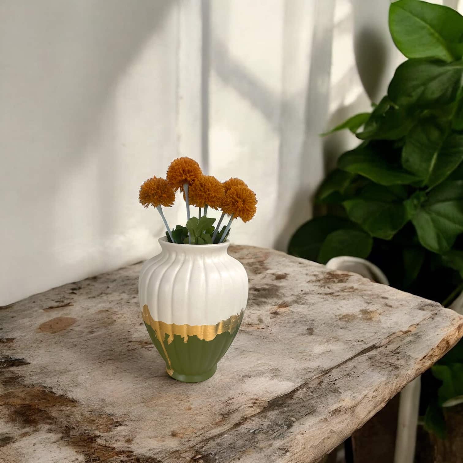 Ce vase vert et blanc représente l’équilibre parfait entre simplicité et élégance. Relooké avec soin dans une démarche de revalorisation, il est idéal pour apporter une touche de nature à votre décoration. Les teintes vertes vibrantes et le blanc pur se combinent pour créer une pièce harmonieuse et intemporelle.